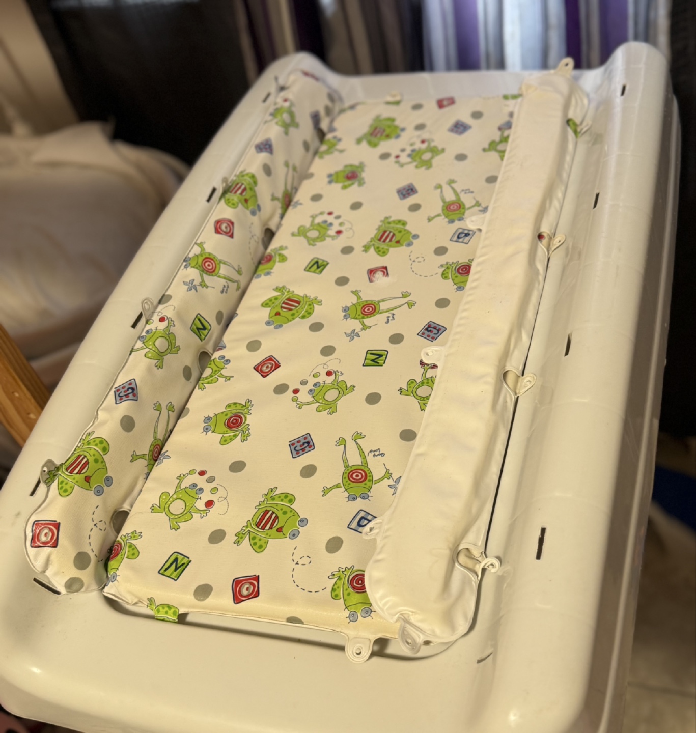 Here's a Burigotto Milenia baby changing table in great condition! It's white with a cute frog pattern on the changing pad. Perfect for keeping your little one comfy and safe during diaper changes