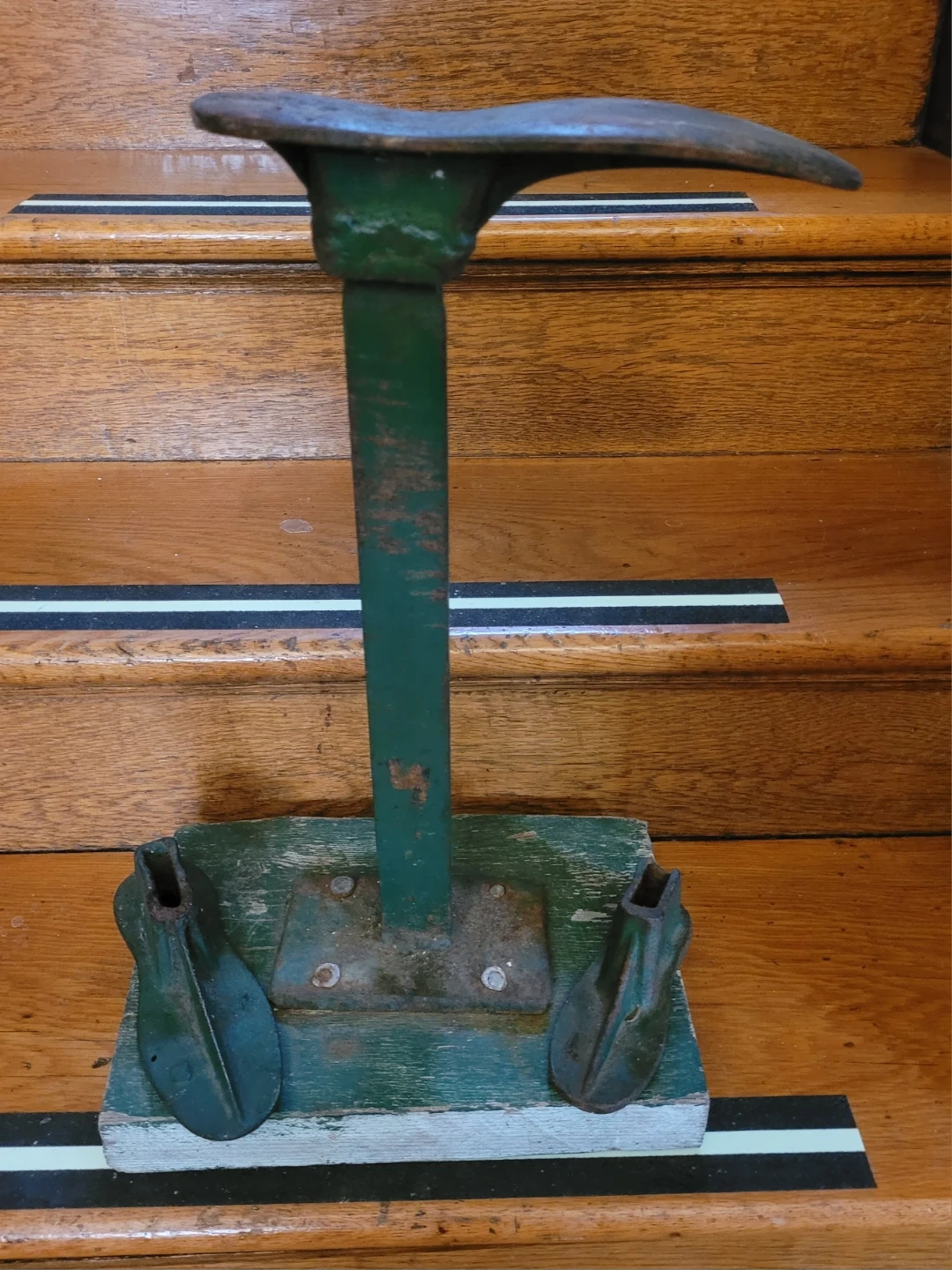 Set of three cast iron shoe lasts and a shoe last stand. These sturdy vintage tools are made of cast iron with a green patina. They're great for cobblers or anyone looking for unique display pieces.