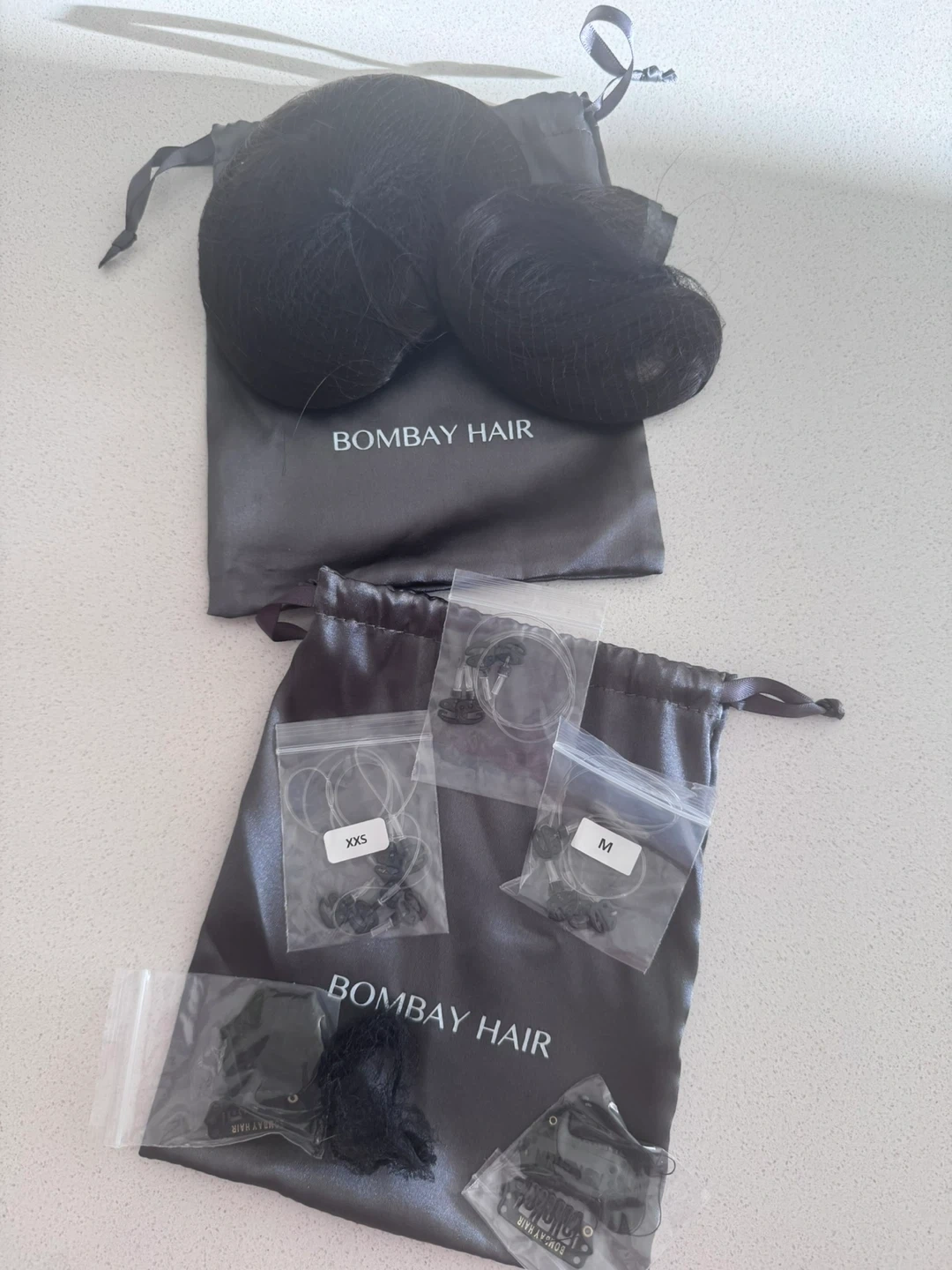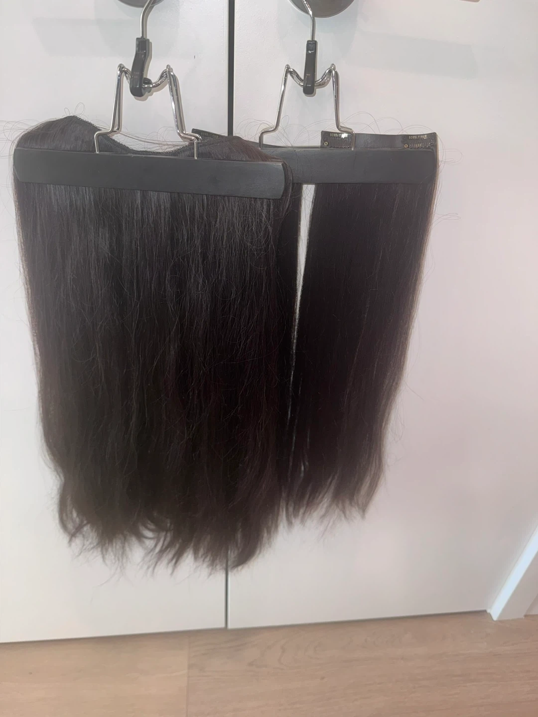 This is a set of Bombay Hair Halo Extensions in Dark Brown (2A) shade. Comes with various sized replacement wires and clips. It's made of high-quality synthetic hair. These extensions add instant volume and length to your hair!