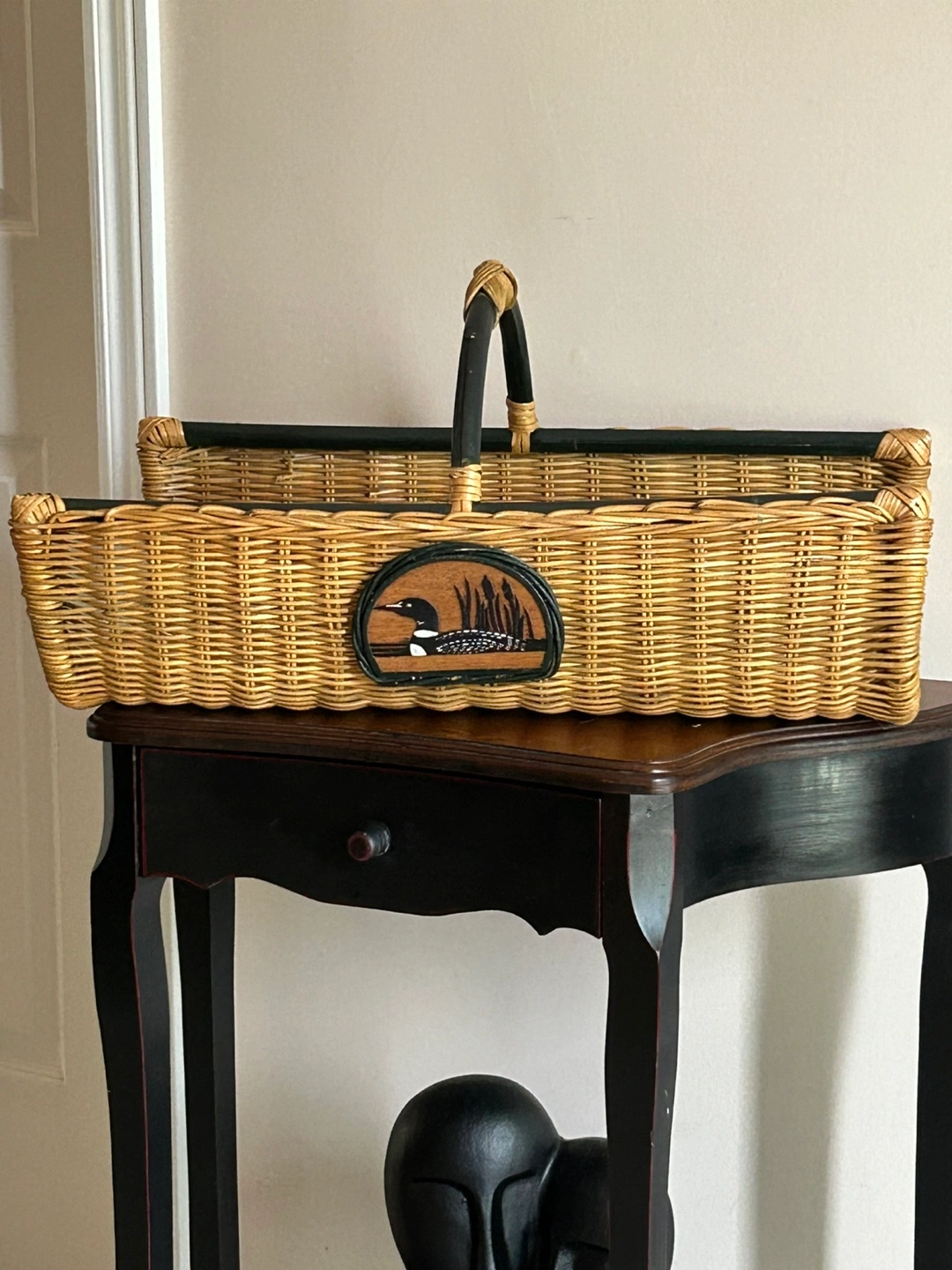 This wicker basket has a handle and the body of the basket is rectangular shaped. Features painted accents and a decorative panel with a bird. Place this basket in your living room for a calming experience.