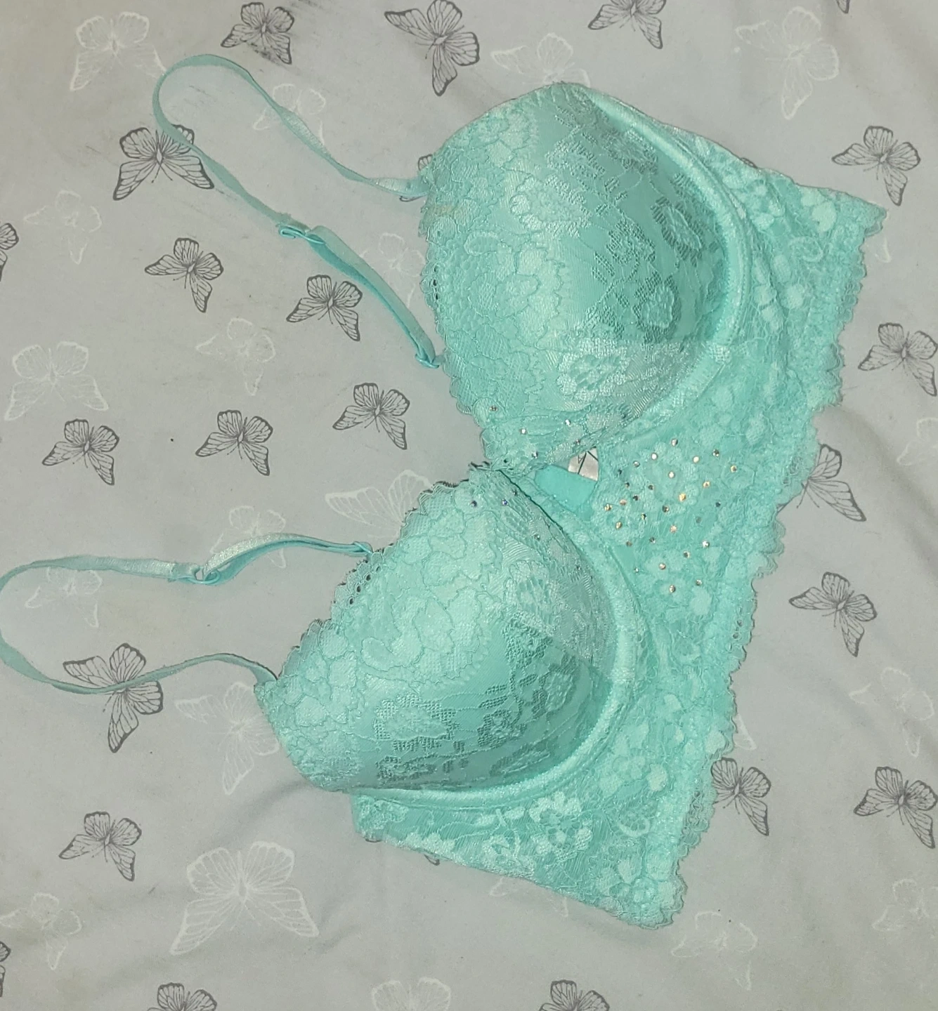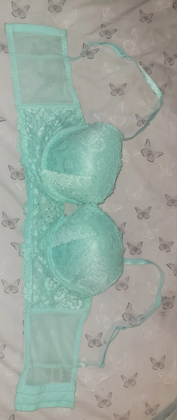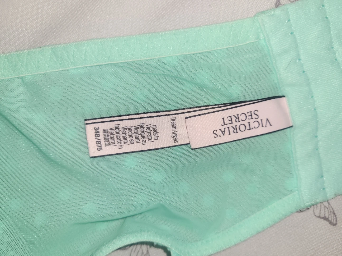 Victoria's Secret Dream Angels bra in a light blue colour. It's a 34B size. The bra features intricate lace detailing and some subtle rhinestones on the front.