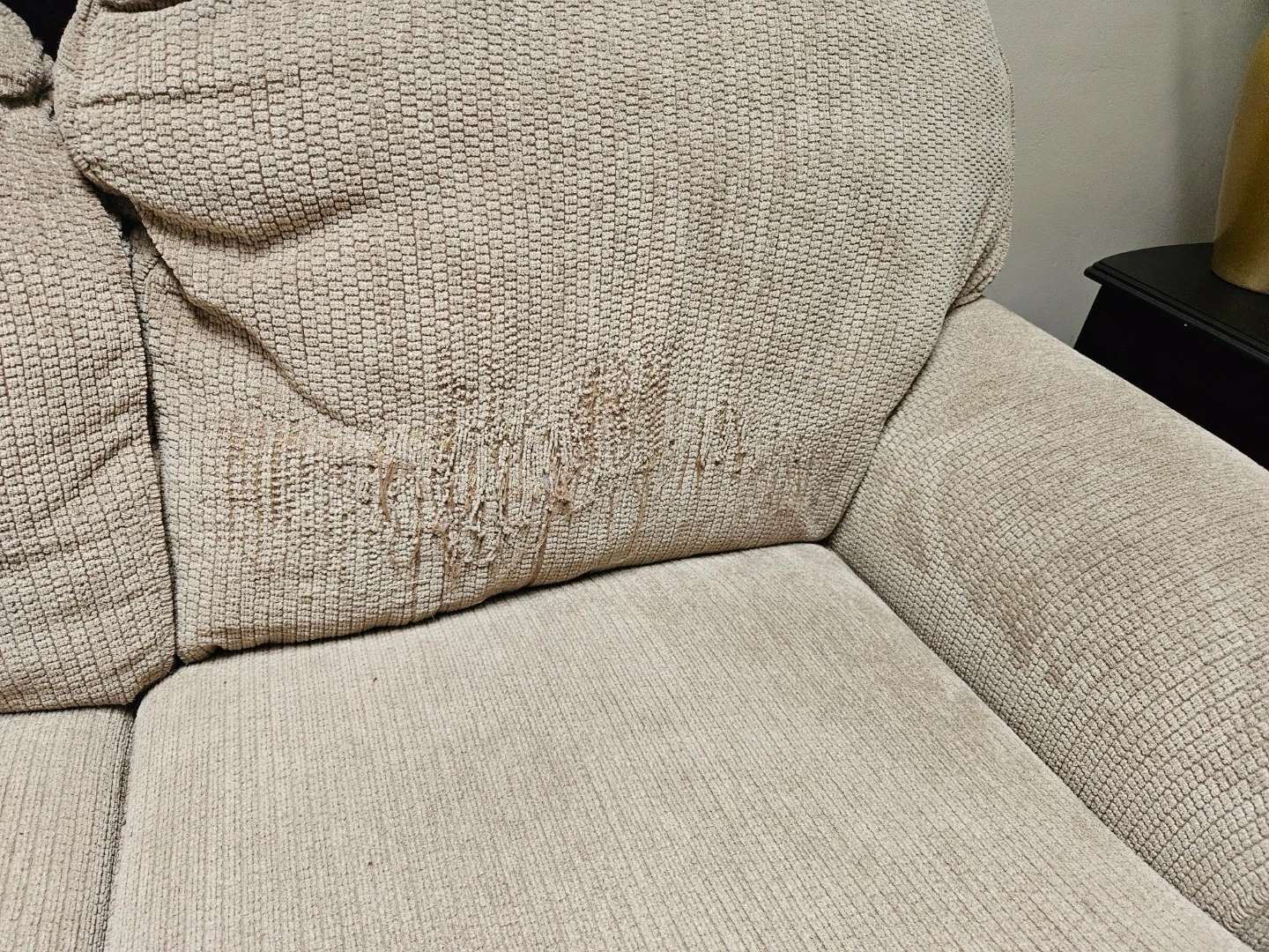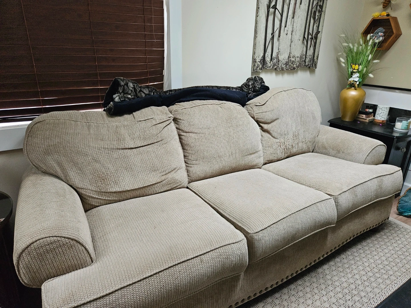 This beige upholstered sofa set includes a sofa, a double chair, and an ottoman. It's made with a textured fabric and features decorative nailhead trim and wooden bun feet. There is some wear and tear on the back cushion of the sofa.
