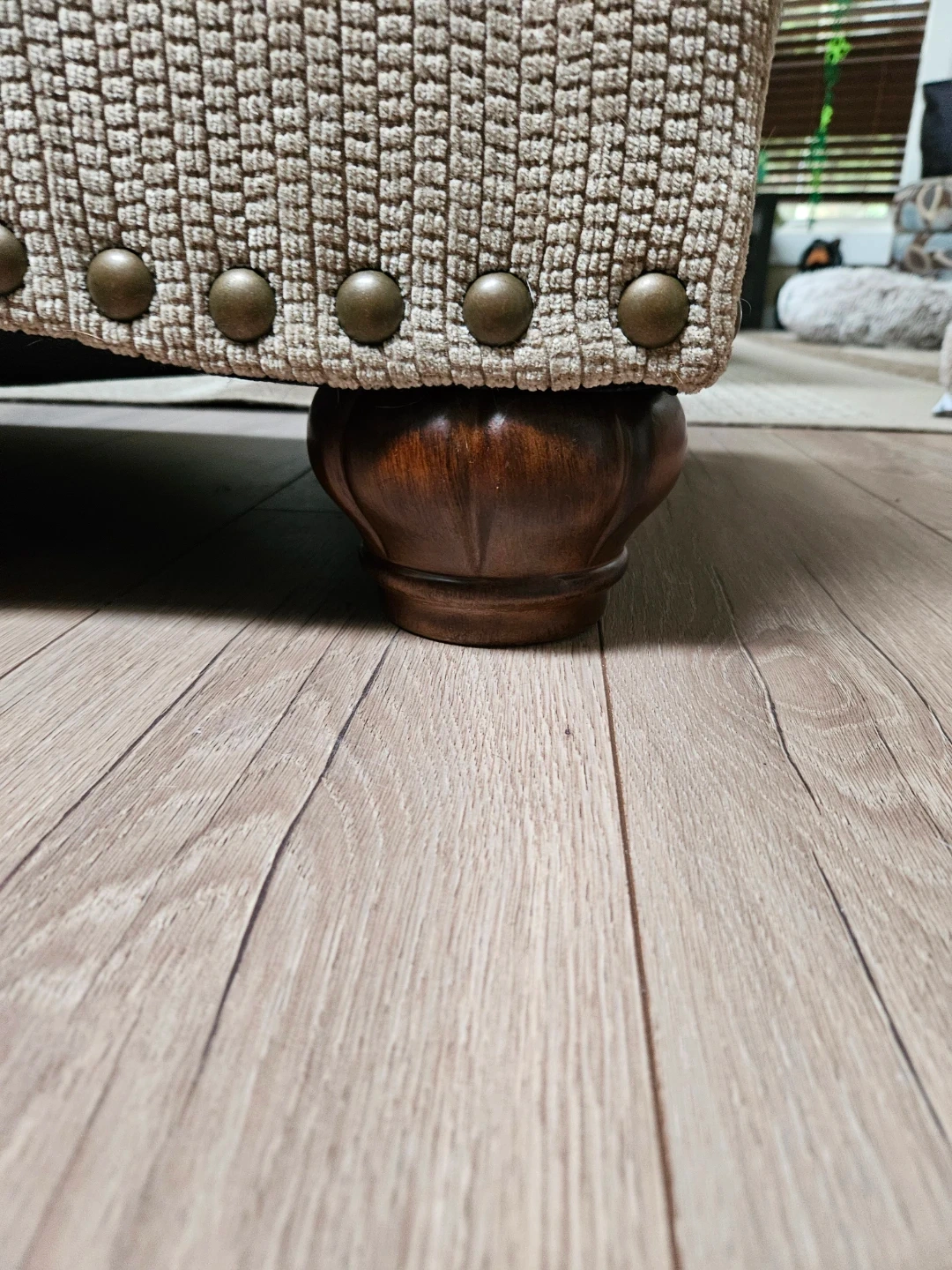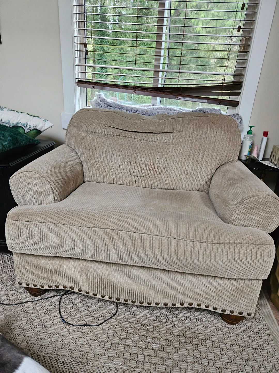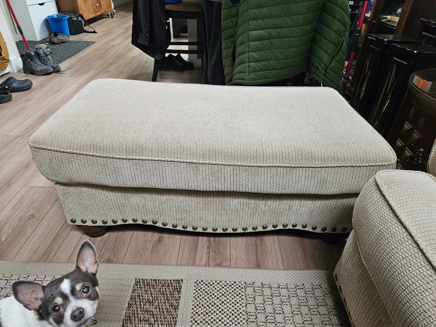 This beige upholstered sofa set includes a sofa, a double chair, and an ottoman. It's made with a textured fabric and features decorative nailhead trim and wooden bun feet. There is some wear and tear on the back cushion of the sofa.