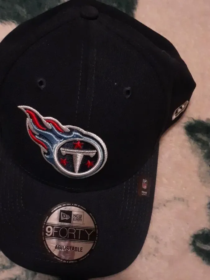 This is a black, adjustable New Era 9FORTY baseball cap featuring the Tennessee Titans logo. It's an officially licensed NFL team apparel item. This cap is suitable for any fan wanting to show their team spirit!