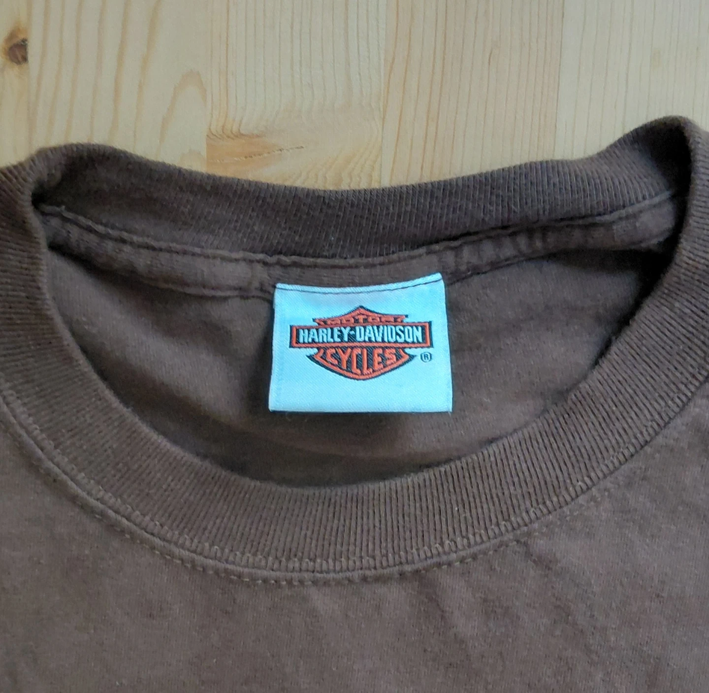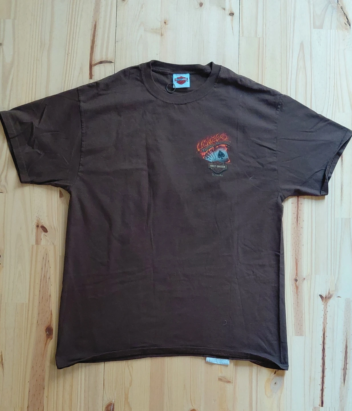 Selling a Harley-Davidson t-shirt in brown. It features a graphic design on the front and back. Great for any Harley enthusiast!