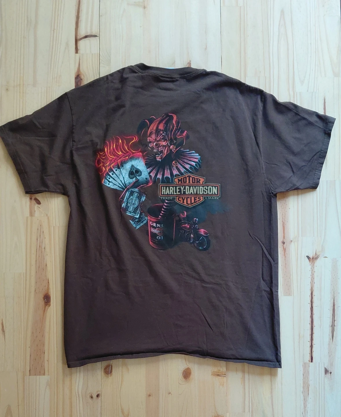 Selling a Harley-Davidson t-shirt in brown. It features a graphic design on the front and back. Great for any Harley enthusiast!