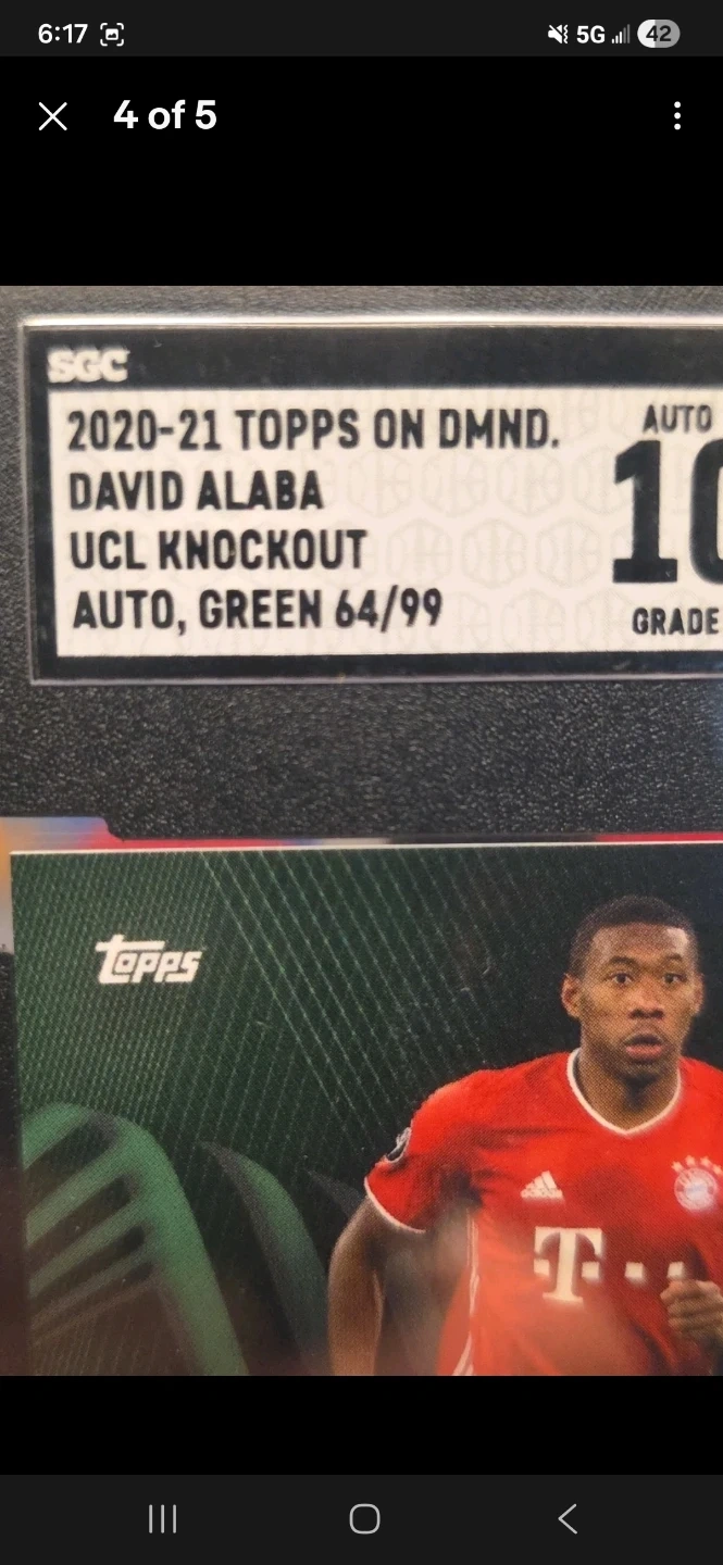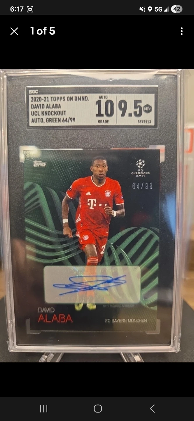 Selling a 2020-21 Topps On Dmnd David Alaba UCL Knockout Auto, Green 64/99. It has been graded 9.5. The card features David Alaba from FC Bayern Munchen.