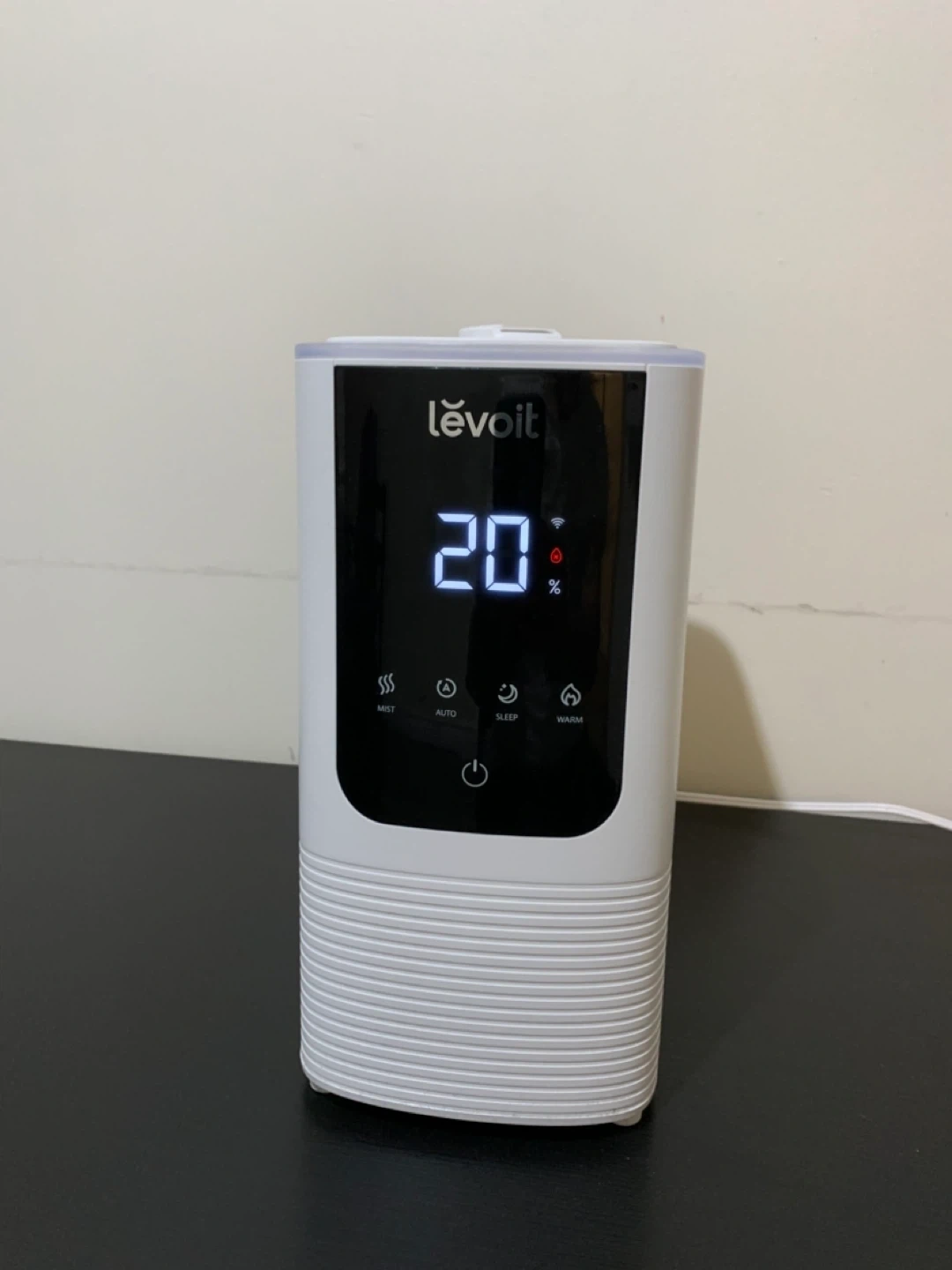 This is a **Levoit humidifier** that displays the current humidity level in real time. It features multiple modes, including mist, auto, and sleep, along with both cool and warm mist settings. The device can also be conveniently controlled through a mobile app.