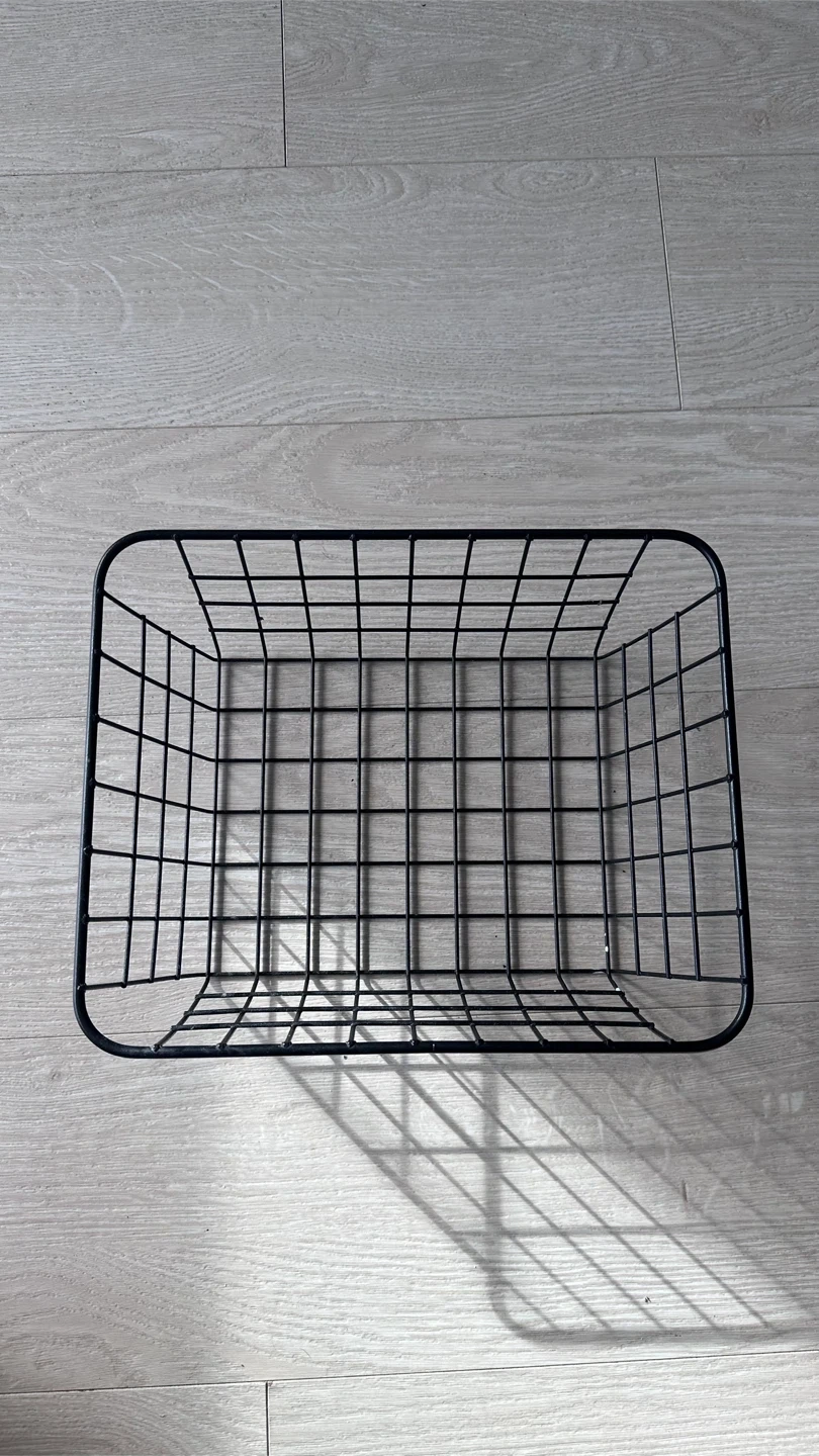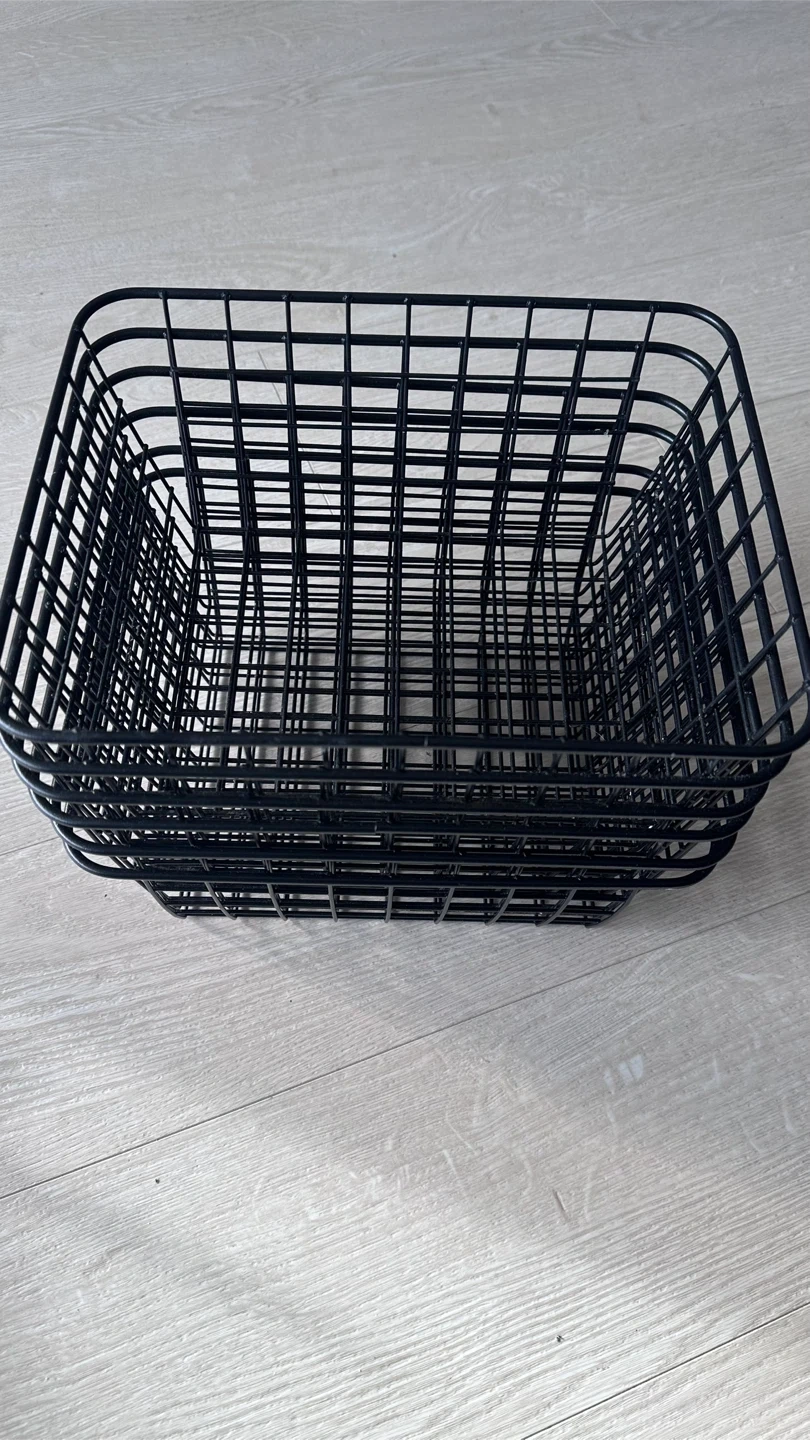 This is a black wire storage basket. It's made of metal. It's great for organizing items in your home.