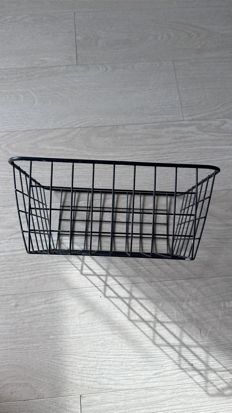 This is a black wire storage basket. It's made of metal. It's great for organizing items in your home.