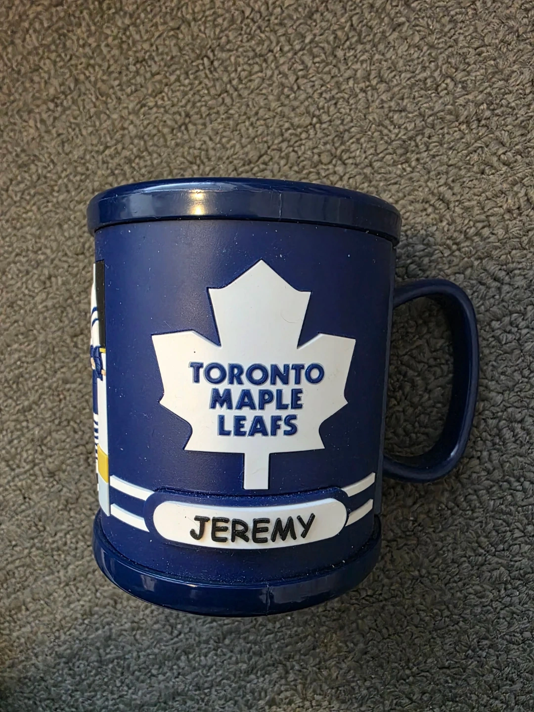 Show your team spirit with this navy blue Toronto Maple Leafs mug featuring "Jeremy" on the front. It displays a hockey scene with players and the iconic maple leaf logo. Machine washable and made in China under NHL team license. It's a great way for any fan to enjoy their morning beverage!