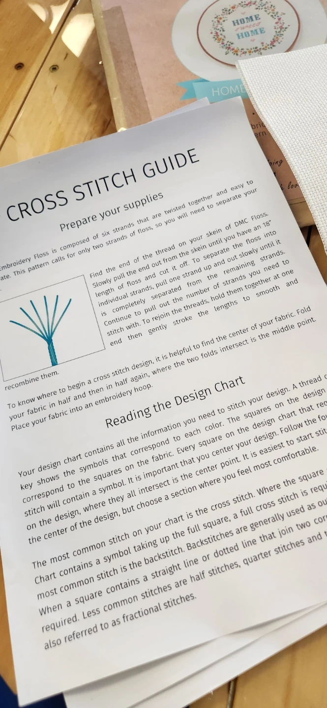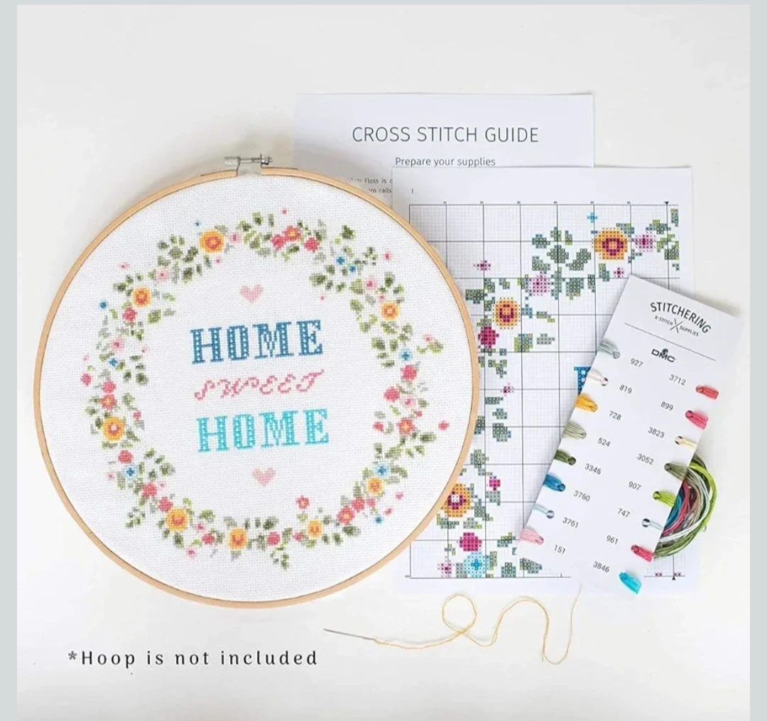 This counted cross stitch kit includes DMC embroidery floss, Aida fabric, a needle, and a pattern. It's a beginner's guide to creating a "Home Sweet Home" design. Great for learning a new craft!