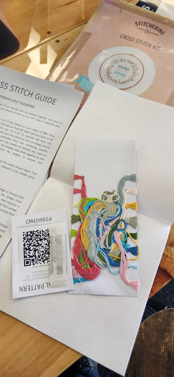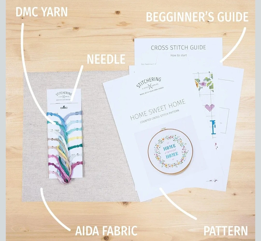 This counted cross stitch kit includes DMC embroidery floss, Aida fabric, a needle, and a pattern. It's a beginner's guide to creating a "Home Sweet Home" design. Great for learning a new craft!