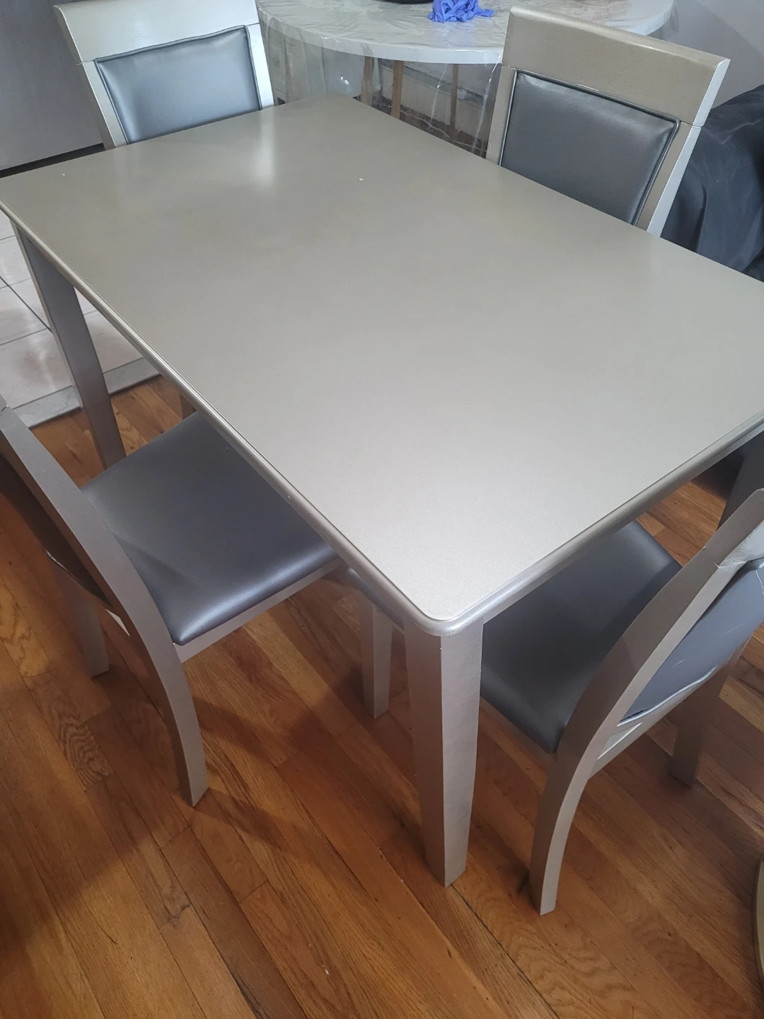 A set of four dining chairs with a matching table. Chairs have gray upholstered seats and backs with a light wood frame. Table has a metallic gray finish. Seats four people comfortably.