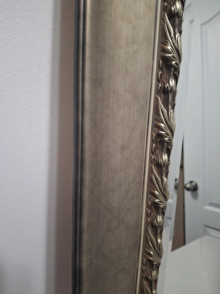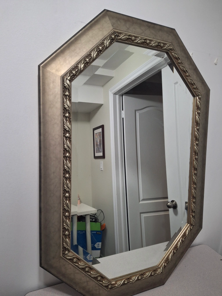 25Negotiable. A decorative octagon-shaped wall mirror. Features a silver-coloured frame with ornate detailing. Perfect for adding light to any room.