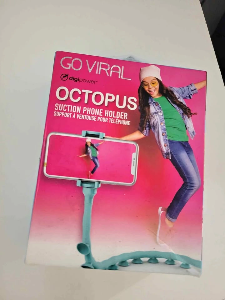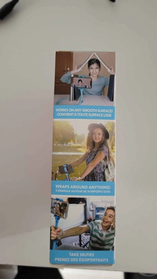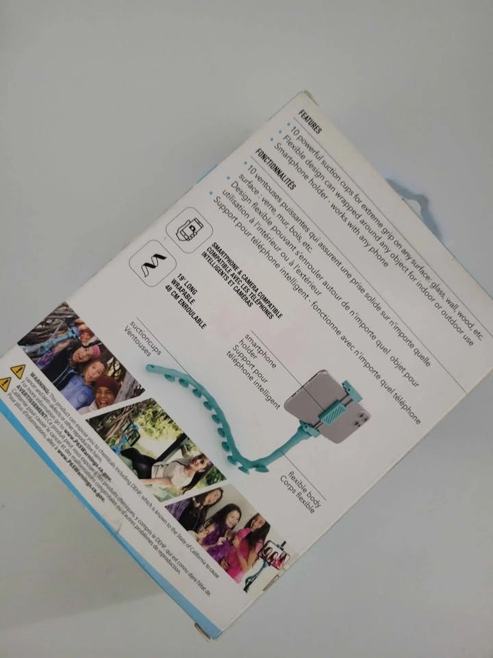 10Never used. Flexible design can wrap around any object for indoor or outdoor use. Smartphone holder to work on any size phone. Very flexible body Powerful suction cups for extreme grip on any smooth surface: glass, wall, wood and much more. Works on any smooth surface, wraps around anything, can also function as a selfie stick.