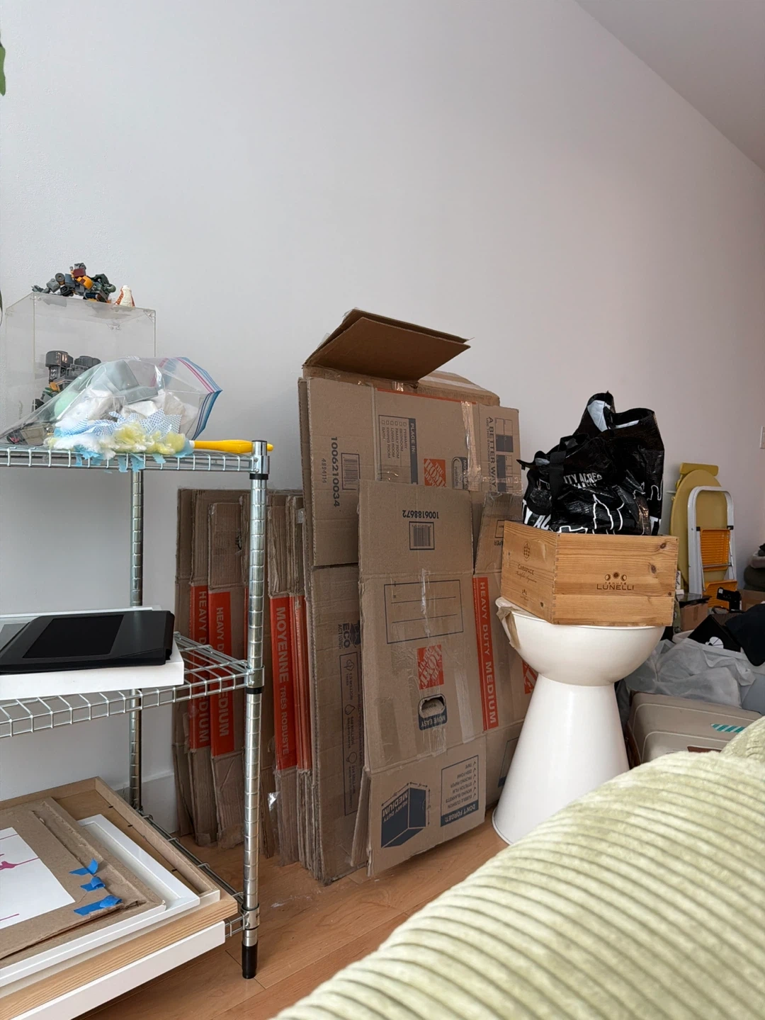 Stack of medium-sized, heavy-duty moving boxes. They're great for packing and transporting items during a move. Boxes are sturdy and ready for use!