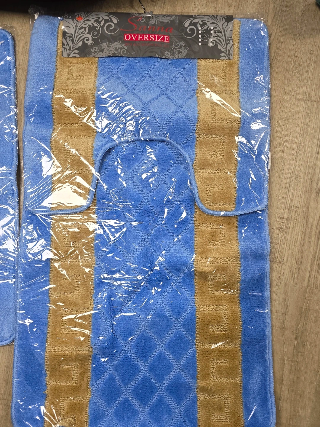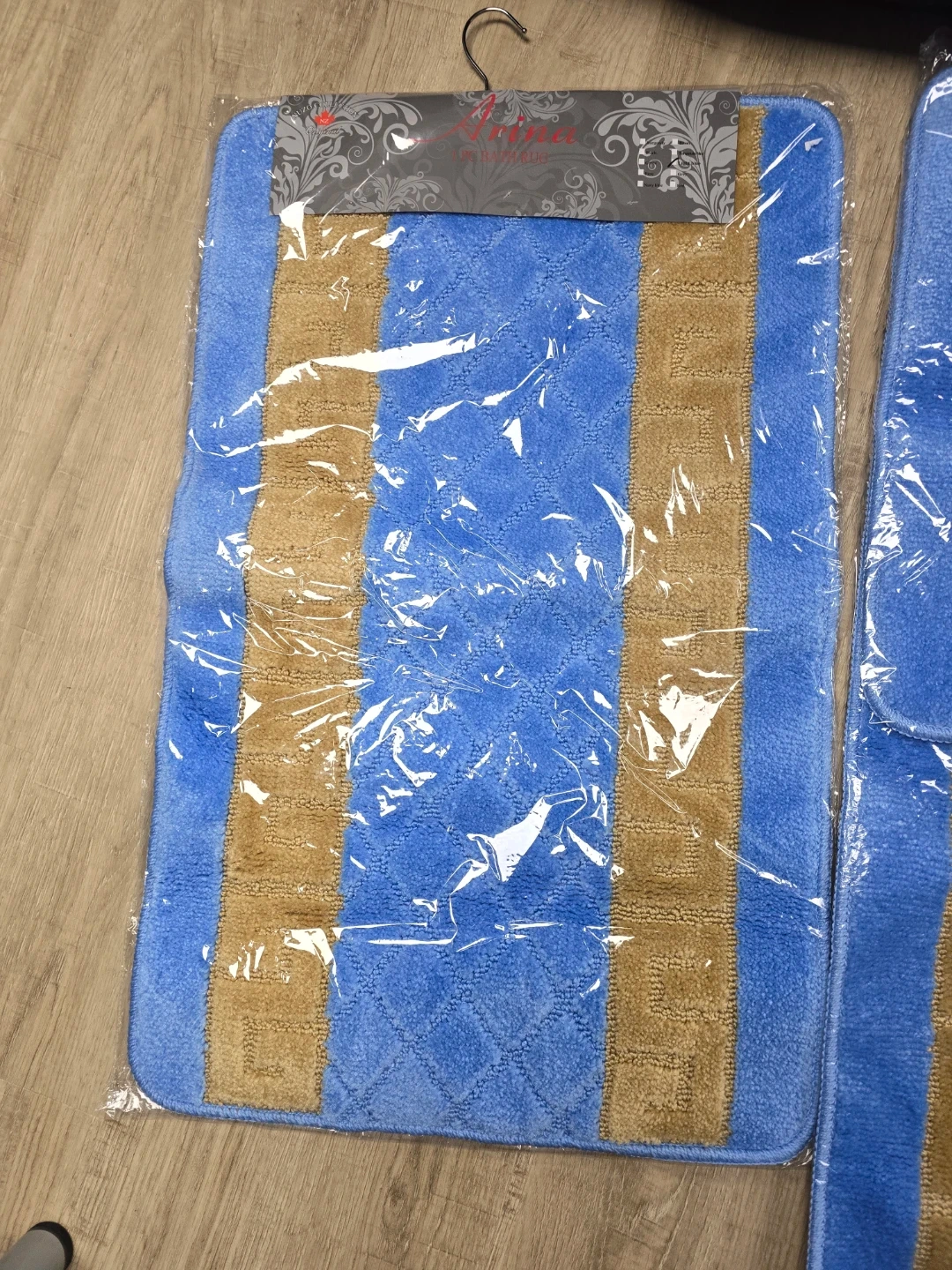 This is a two-piece bath rug set in light blue with brown stripes. The bath mat is 24"x40" and the contour mat is 24"x20". Second Rug set 24"×20" . Both mats are 100% polypropylene with a TPR backing. They're machine washable in cold water using mild detergent.