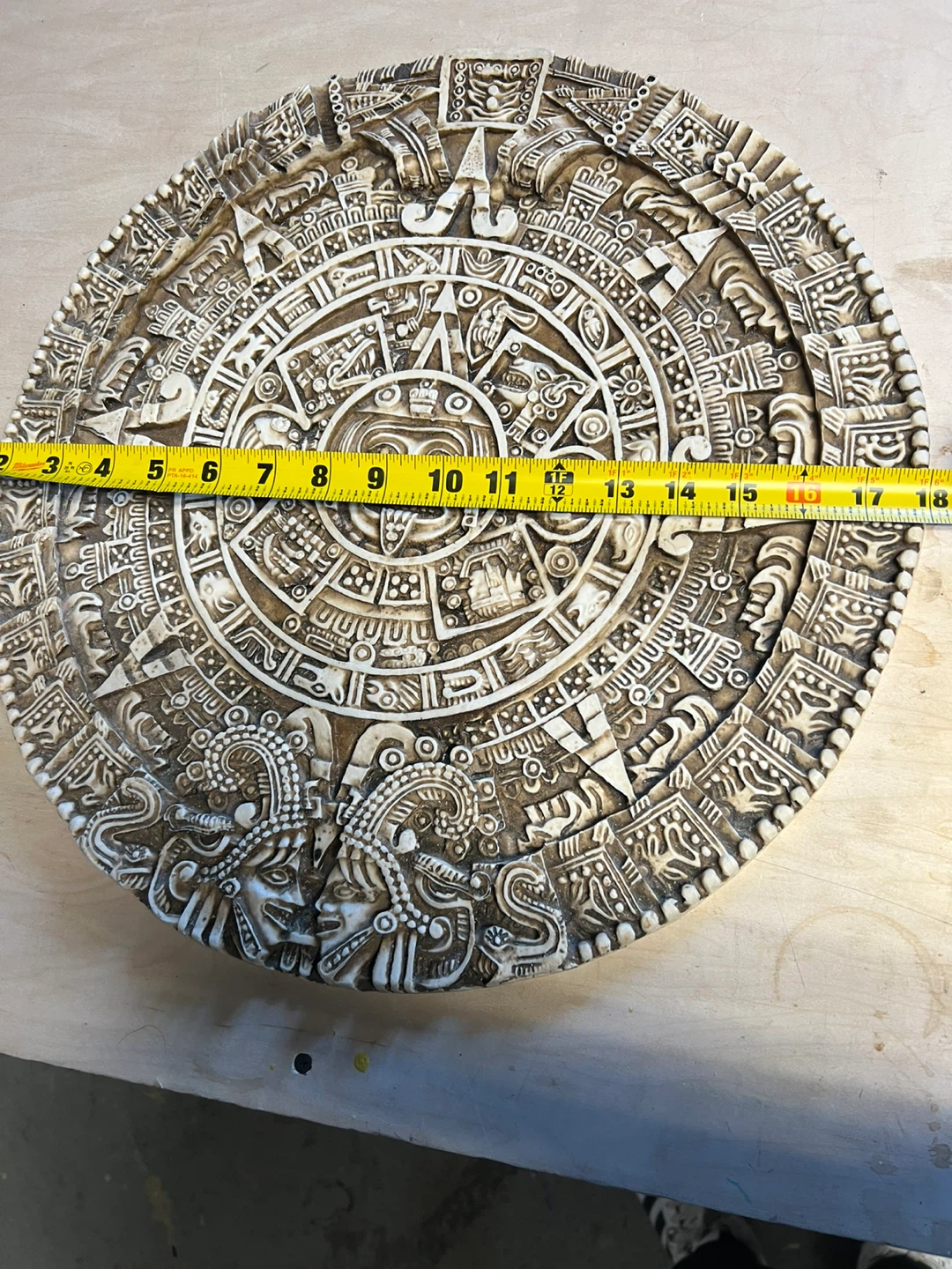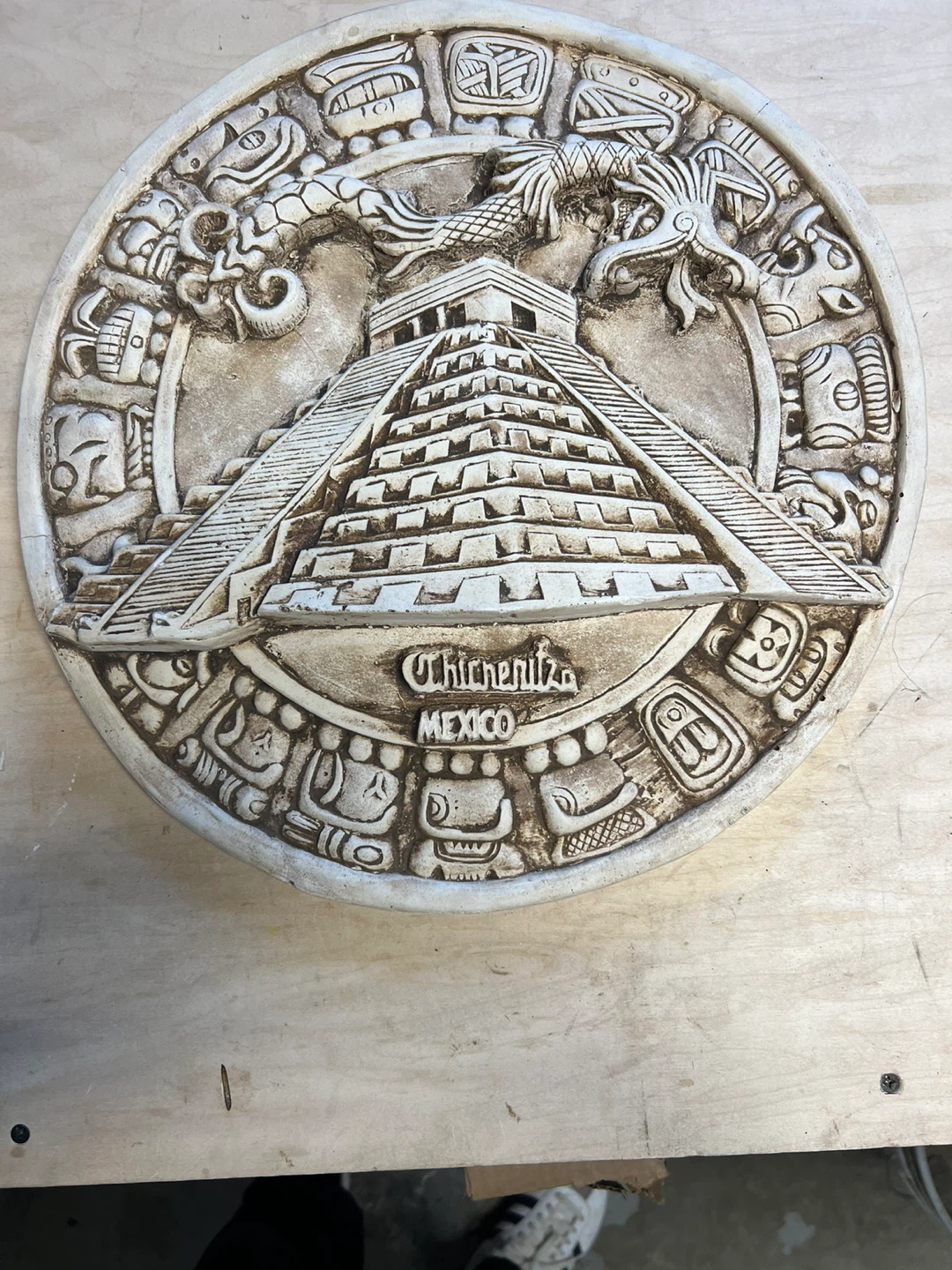 This decorative wall piece features a detailed replica of the Mayan calendar, with 'Chichen Itza Mexico' visible. It measures approximately 15 inches in diameter. It's made of a durable material and includes a hook on the back for hanging. Perfect for adding a touch of history and culture to your space! 25 dollars each