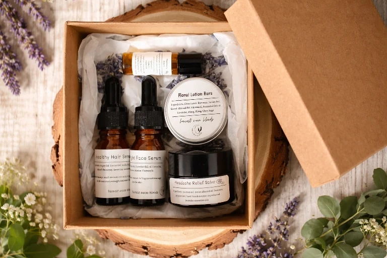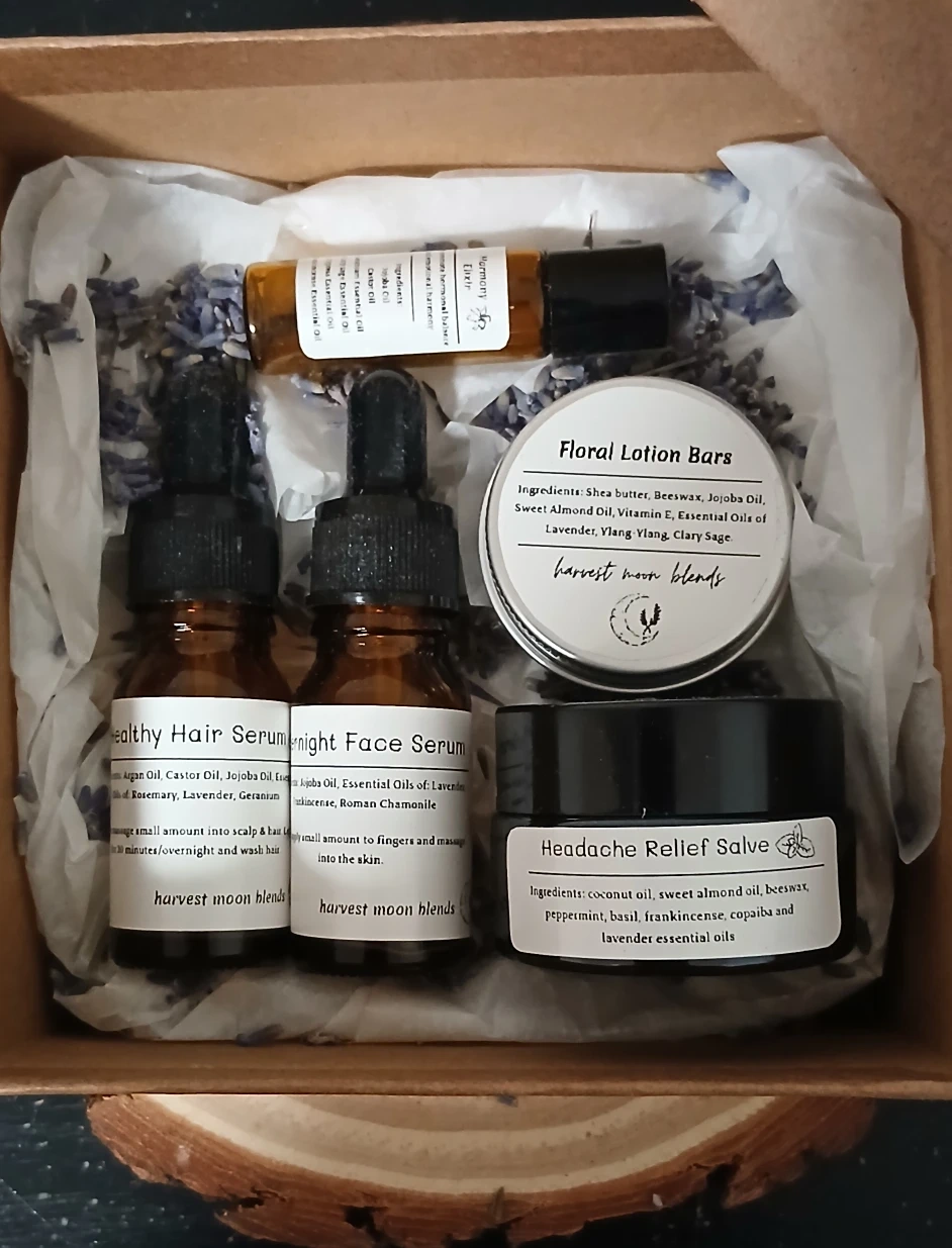 Handcrafted Self-Care Aromatherapy Kit with five wellness essentials made with 100% natural ingredients and high-quality essential oils. It includes: