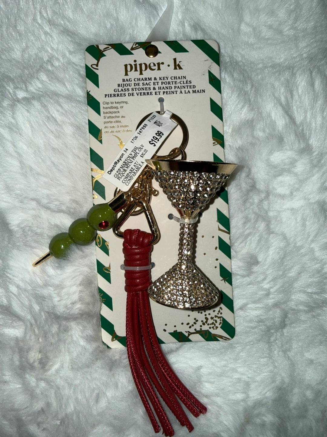 Two adorable bag charms and key chains from Piper-k. Features a sparkly martini glass with a red tassel and a fuzzy swan with pearls. Clip to keyrings, handbags, or backpacks!