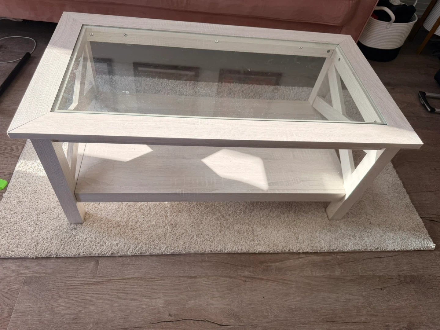 This coffee table has a light wood finish and a clear glass top. It features a lower shelf for extra storage. Its clean design makes it a versatile addition to any living space.