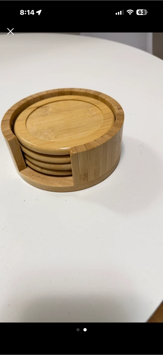 Set of bamboo coasters with a matching holder. Protect your surfaces from drinks. These are great for everyday use!