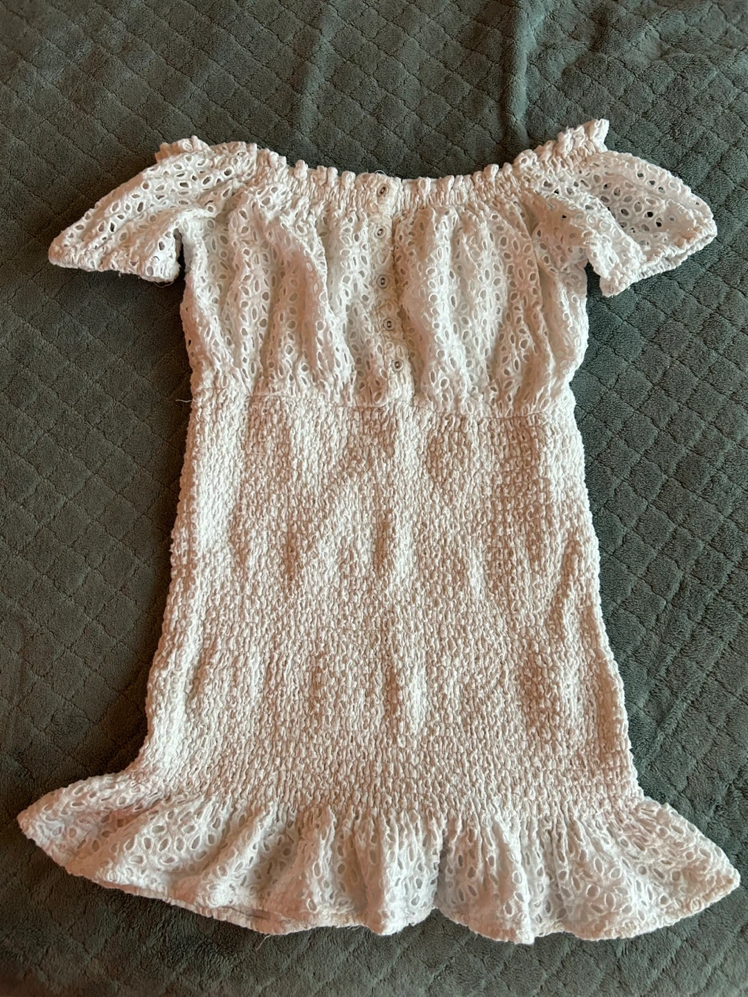 Selling a cute white off-the-shoulder dress! It features a smocked bodice and eyelet detailing. Perfect for summer