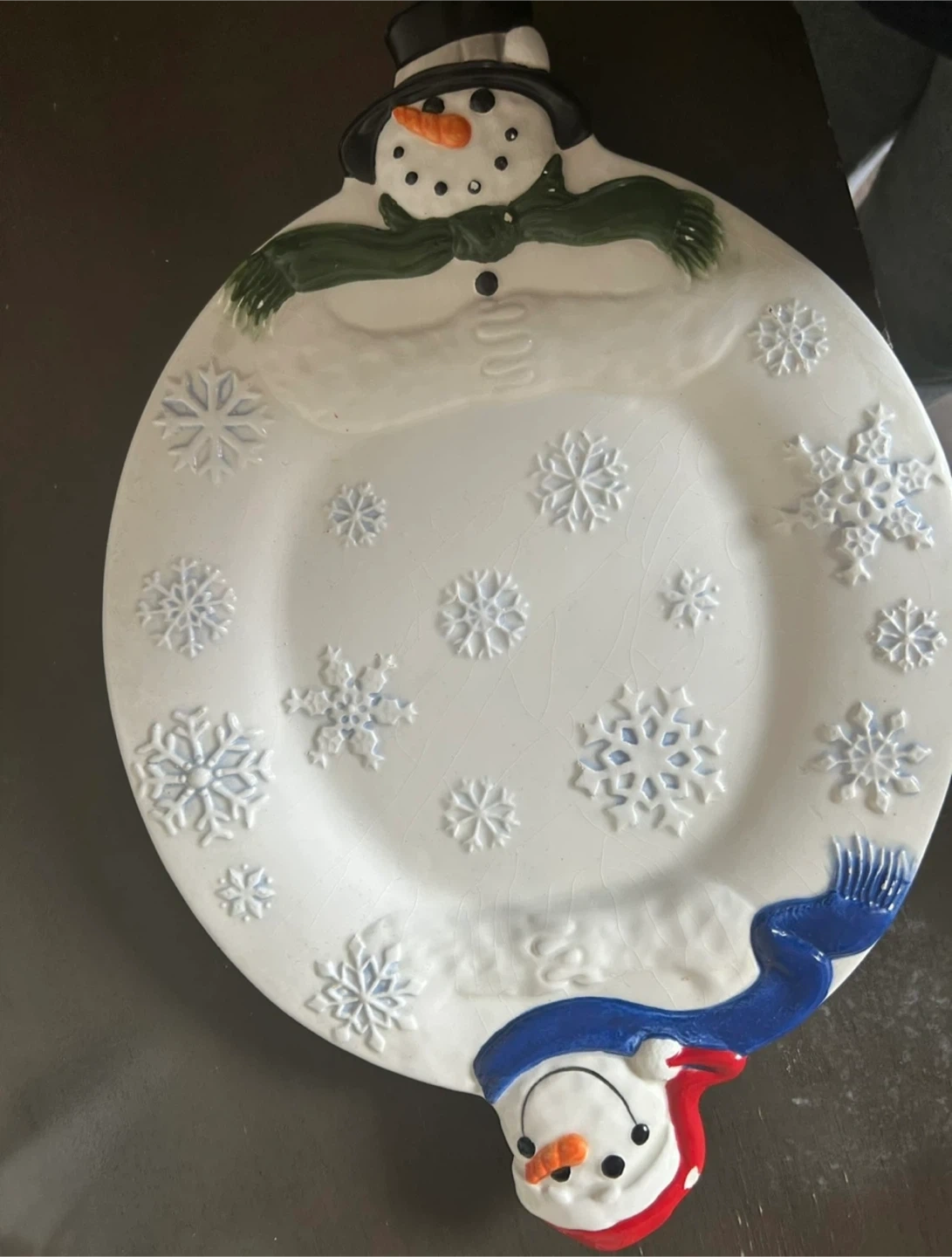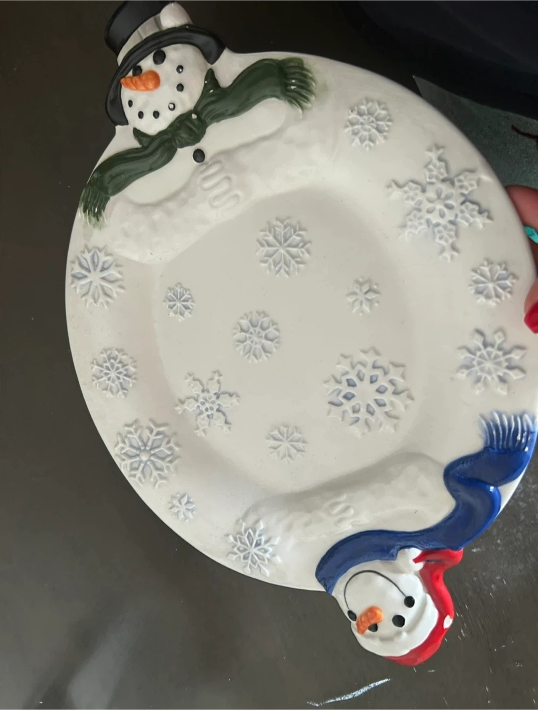 This festive snowman plate is perfect for holiday gatherings! It features a cute snowman design with snowflakes all around. Use it to serve appetizers or desserts during winter celebrations!