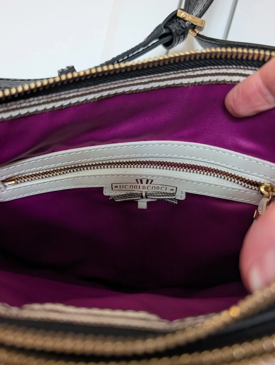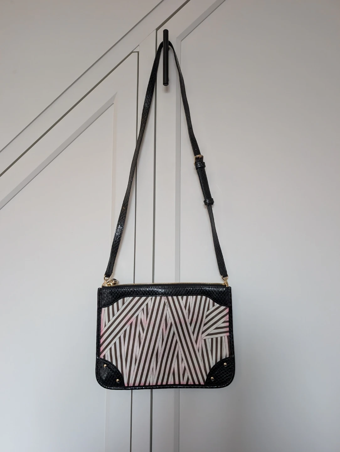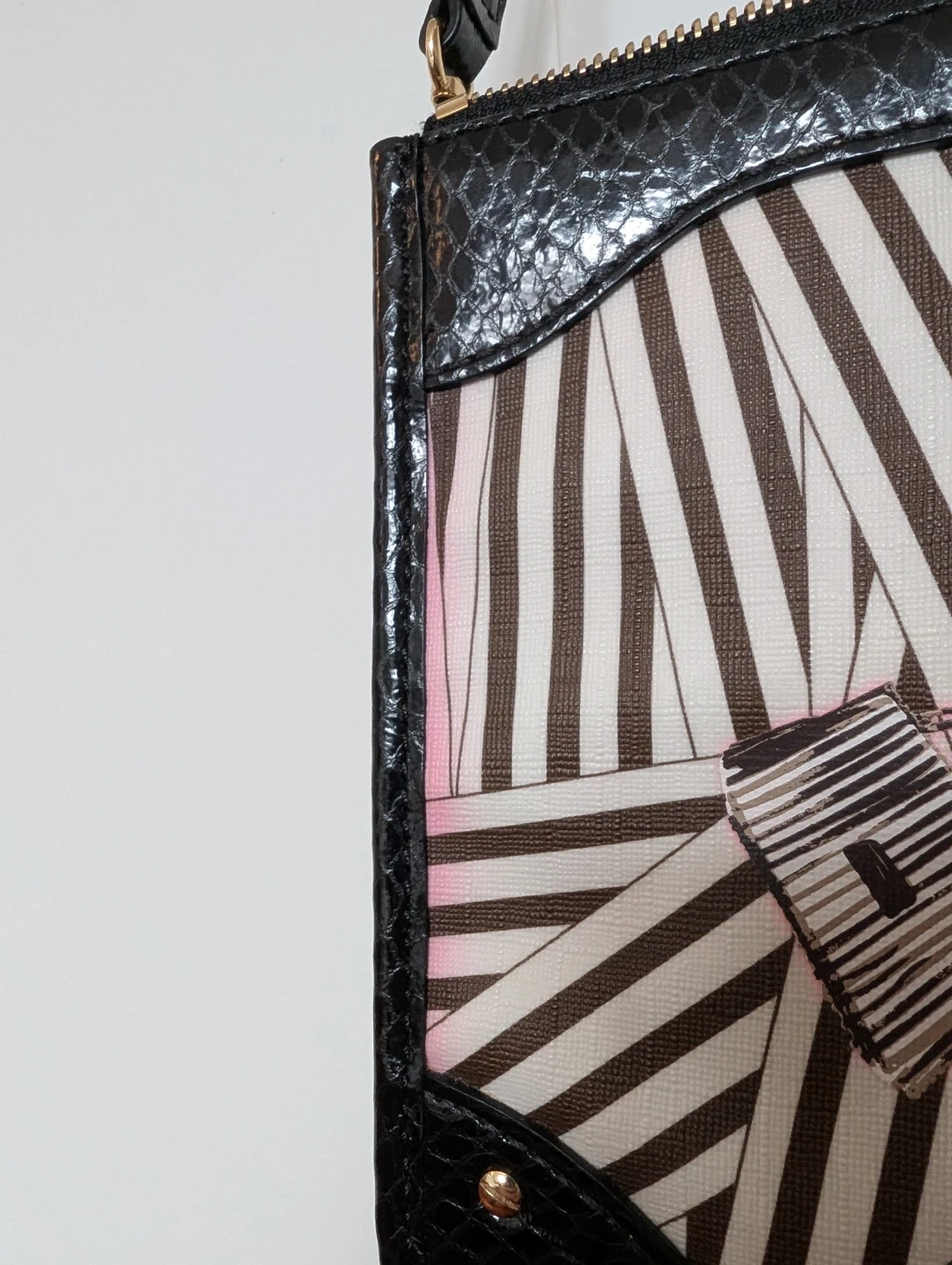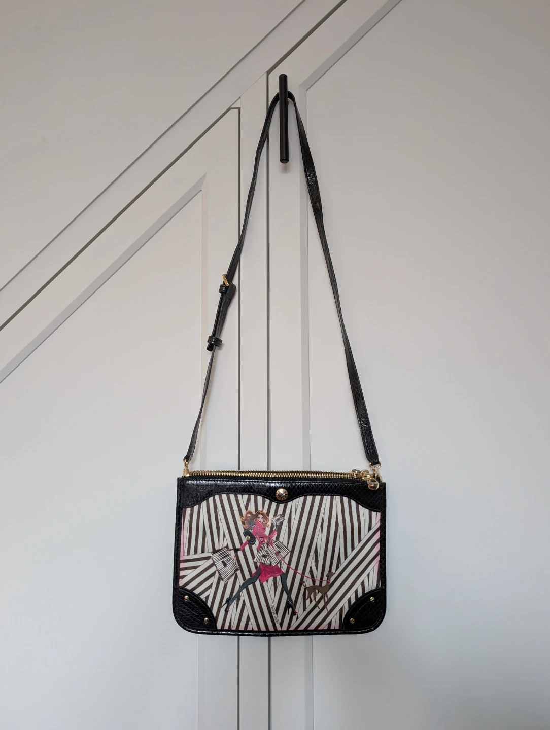 Rare Henri Bendel crossbody bag with a chic illustration. Features the famous brown and white stripes and purple satin interior with black snake skin patent leather trim. Has two large zipper pockets with some colour bleeding (pictured). Comes with original dust bag.