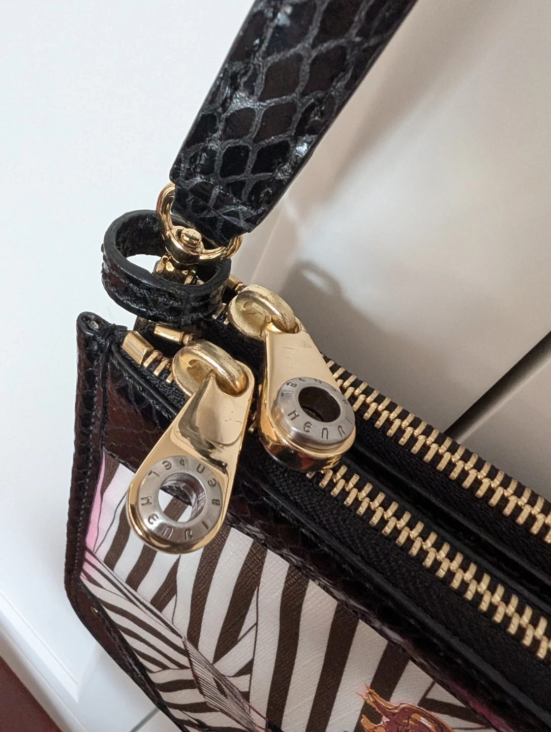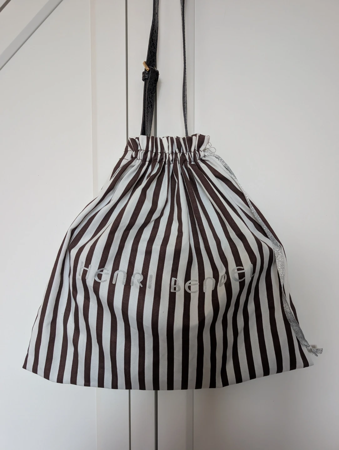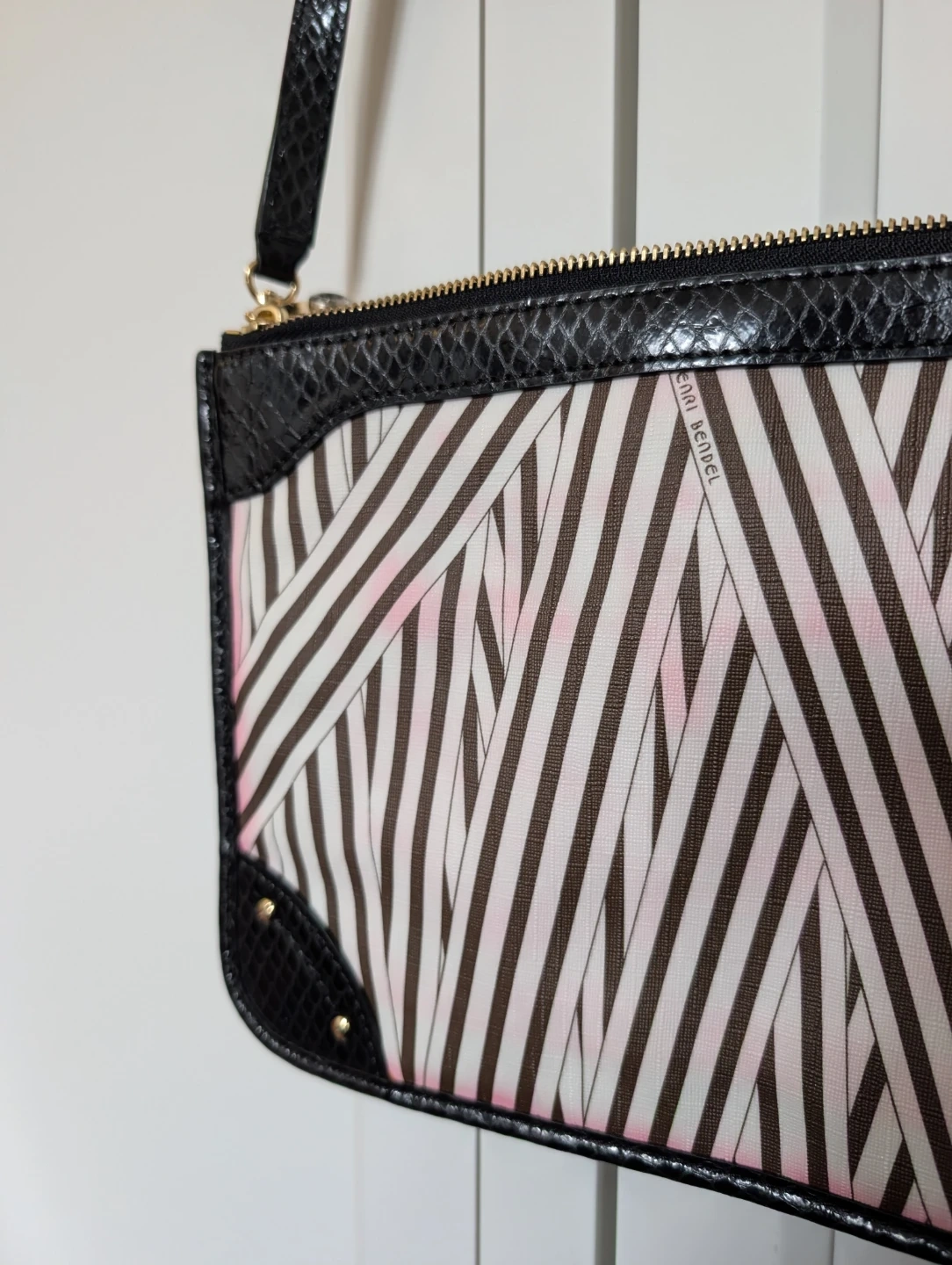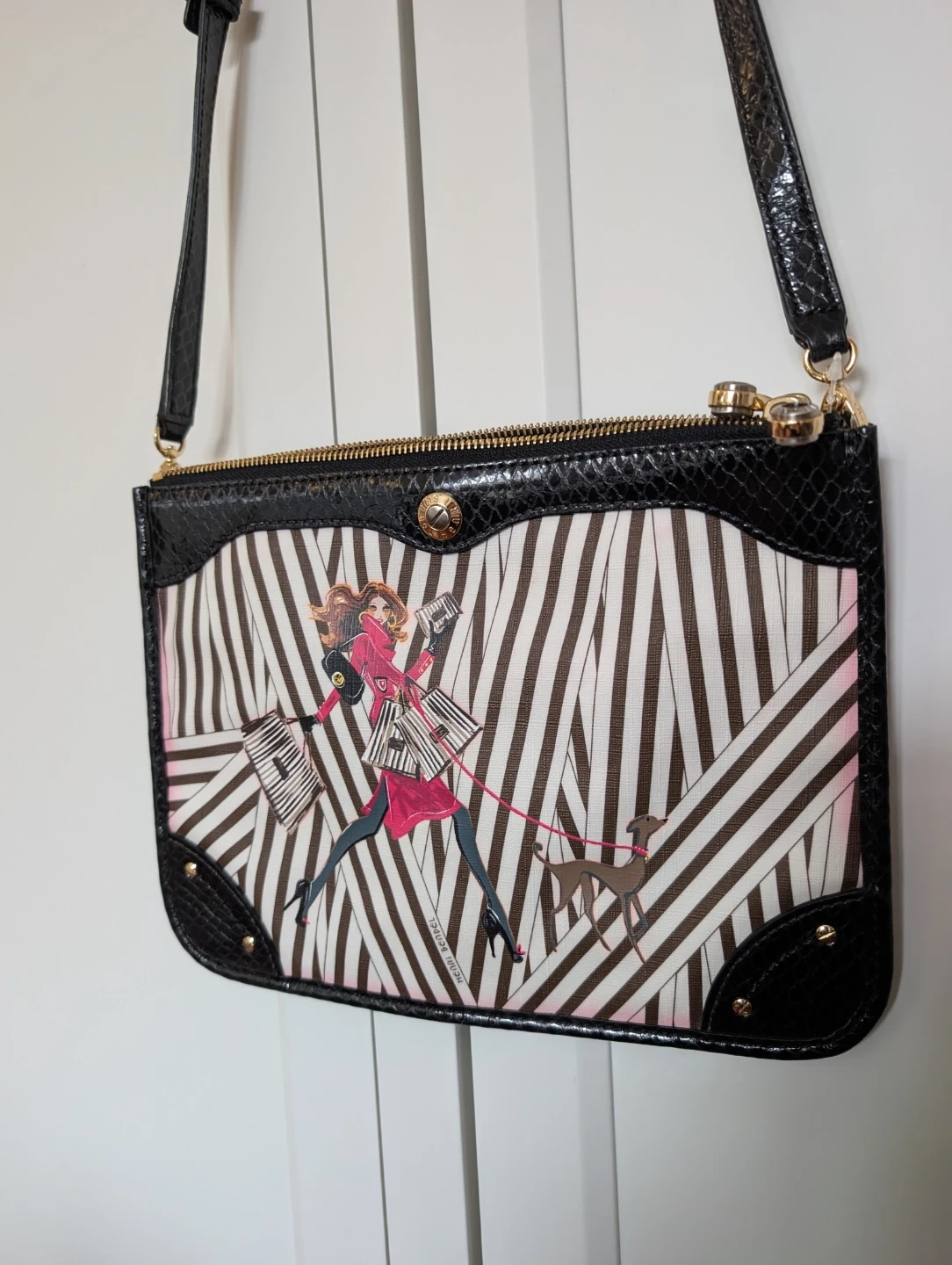 Rare Henri Bendel crossbody bag with a chic illustration. Features the famous brown and white stripes and purple satin interior with black snake skin patent leather trim. Has two large zipper pockets with some colour bleeding (pictured). Comes with original dust bag.