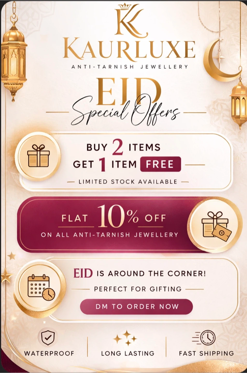 KaurLuxe offers anti-tarnish jewellery with special Eid discounts. Buy two items and get one free, or enjoy a flat 10% off all jewellery! Items are waterproof and long-lasting. Fast shipping is available.