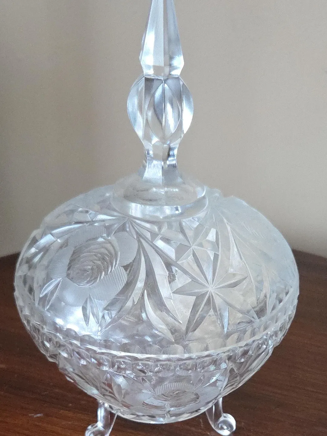 This is a beautiful cut crystal candy dish with a lid. It features intricate floral and starburst patterns all around. The piece is mounted on three small, decorative feet.