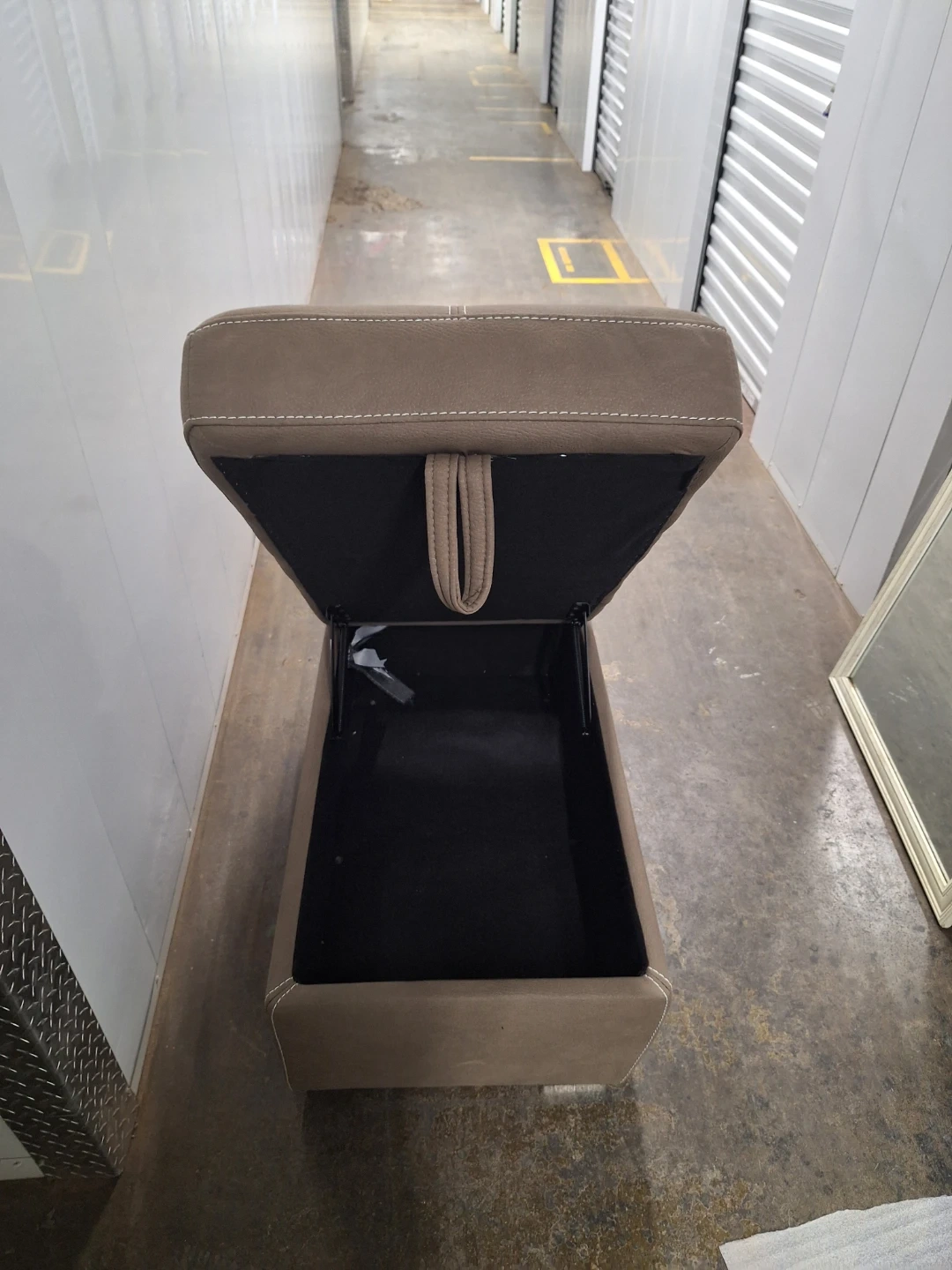This taupe storage ottoman bench offers a great place to sit or rest your feet. It's upholstered in a soft fabric with decorative stitching. The lid opens to reveal ample storage space inside for blankets, pillows, or other items. It's a practical addition to any living room or bedroom!