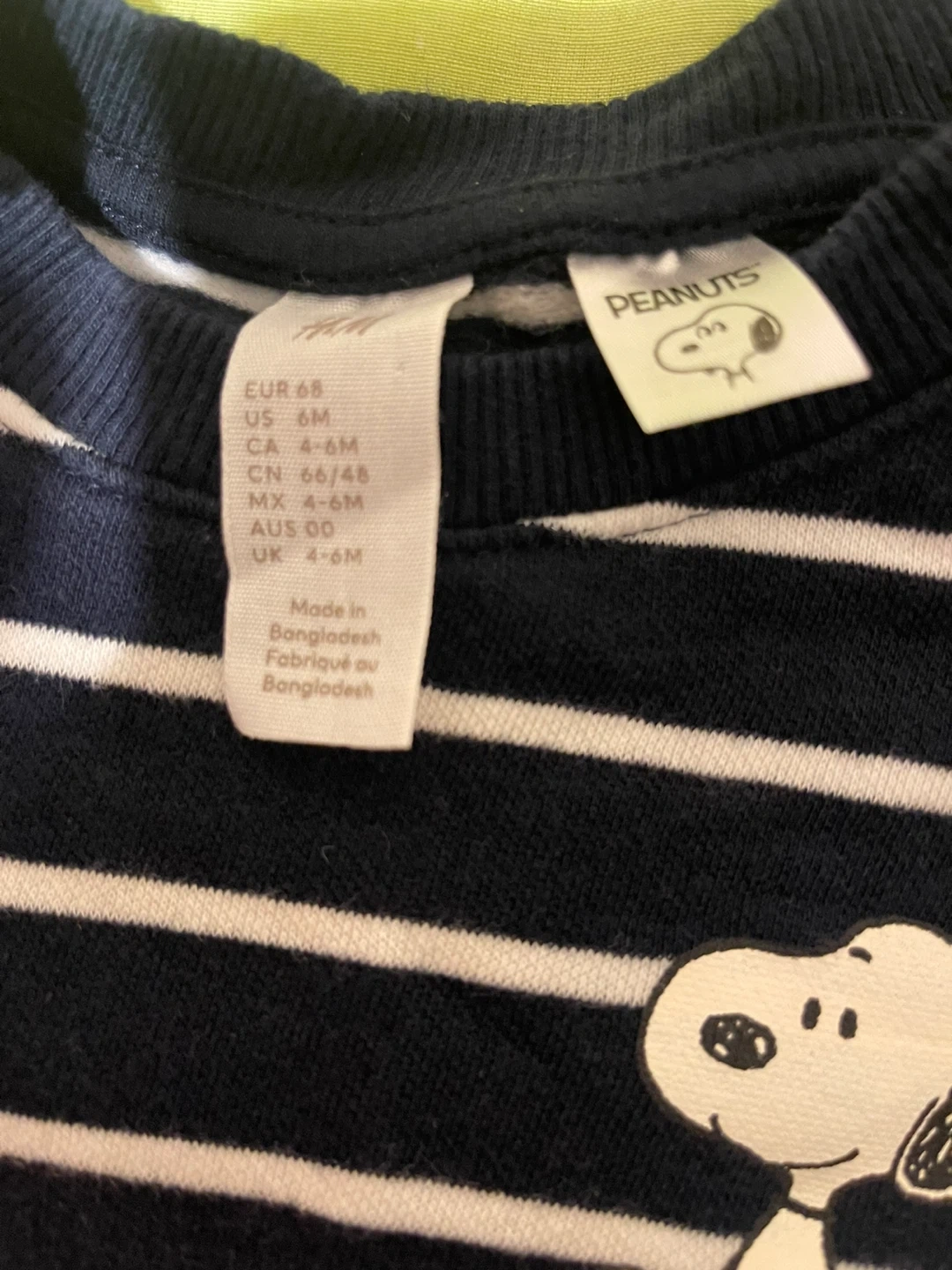 This H&M baby set features a navy and white striped long-sleeve sweatshirt with a Snoopy graphic and matching navy sweatpants with "Snoopy" printed on the leg. Made in Bangladesh. Size 6 months.