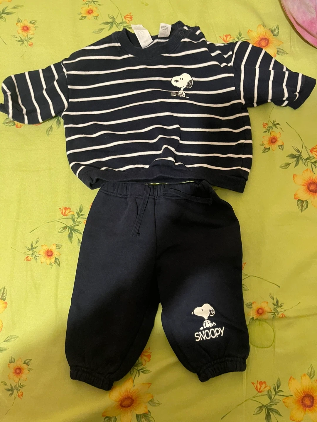 This H&M baby set features a navy and white striped long-sleeve sweatshirt with a Snoopy graphic and matching navy sweatpants with "Snoopy" printed on the leg. Made in Bangladesh. Size 6 months.
