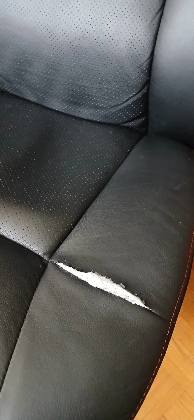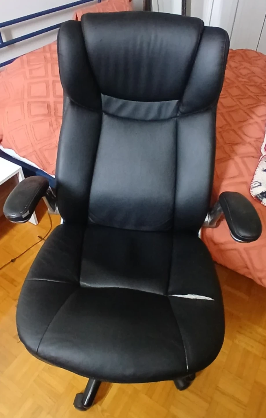 This is a black faux leather office chair. It shows some wear and tear with a rip on the seat and some fraying on the armrests.