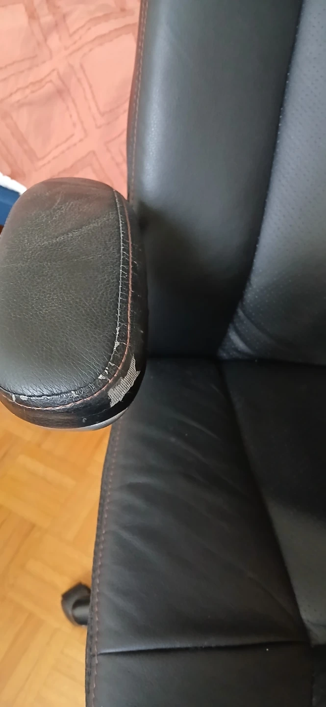 This is a black faux leather office chair. It shows some wear and tear with a rip on the seat and some fraying on the armrests.