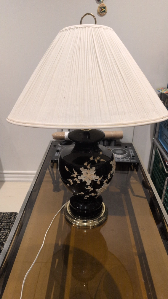 Selling a beautiful black table lamp with a floral design! It features a gold-coloured base and a white lampshade. It would look great in any room!