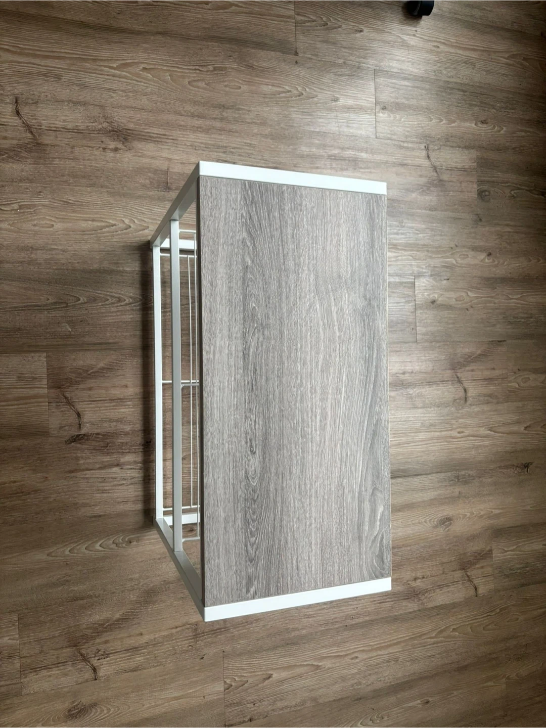 This is a 2-tier wire rack shelf unit. It features a faux wood top surface and a white metal frame. The shelves are made of wire mesh. It's great for entryways or kitchens!