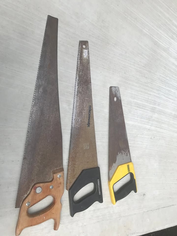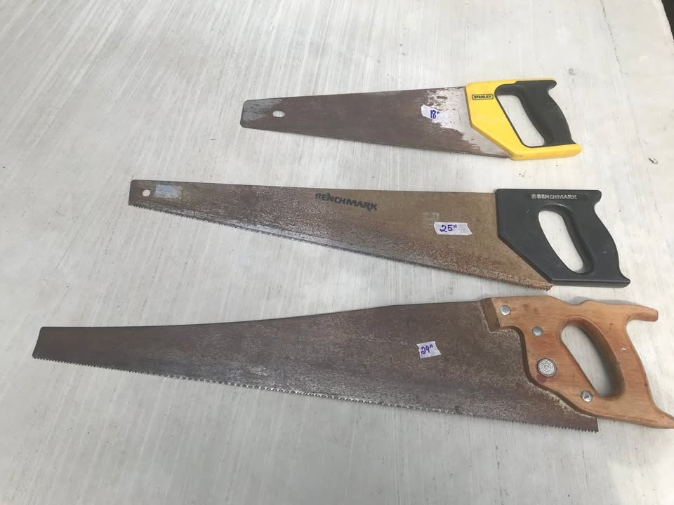 All 3 hand saws for $15. Condition: some rust, see photos. Brands are Disston Canada 29", Stanley 18" & Bench Mark 25". Pickup in Mississauga at Winston Churchill Blvd & Burnhamthorpe Rd W.