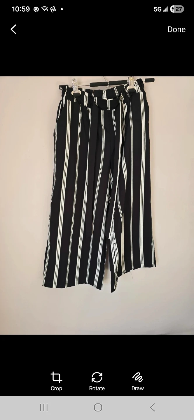 These black and white striped culottes have a paperbag waist and a tie belt. They're a comfortable and stylish option for warm weather. The fabric appears to be lightweight.