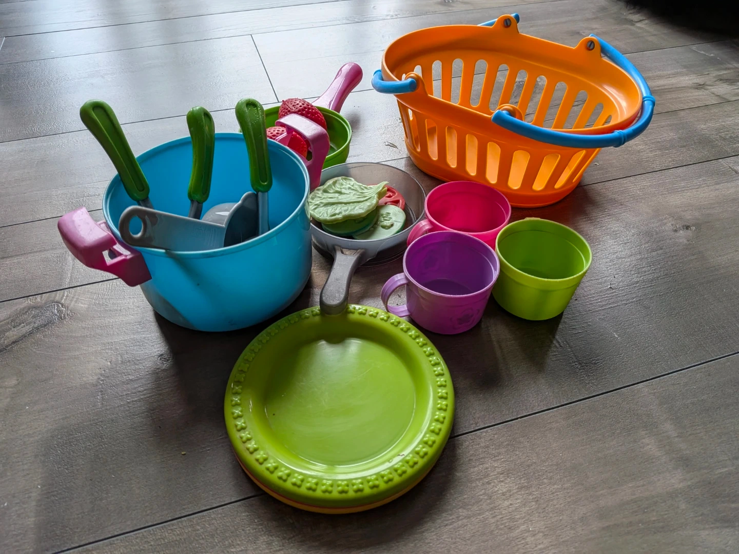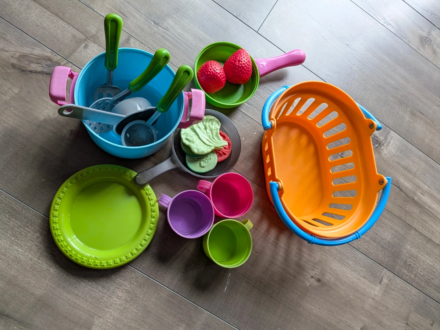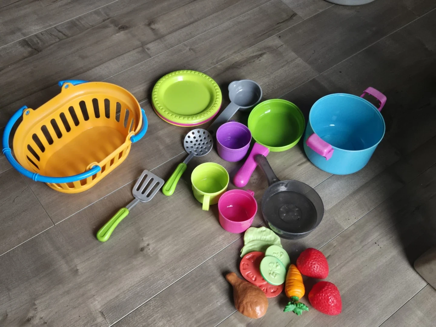 A fun set of toy kitchen items for pretend play. Includes pots, pans, cups, plates, utensils, and a shopping basket. It's made of colourful plastic and suitable for young chefs. These pieces are great for imaginative cooking adventures!