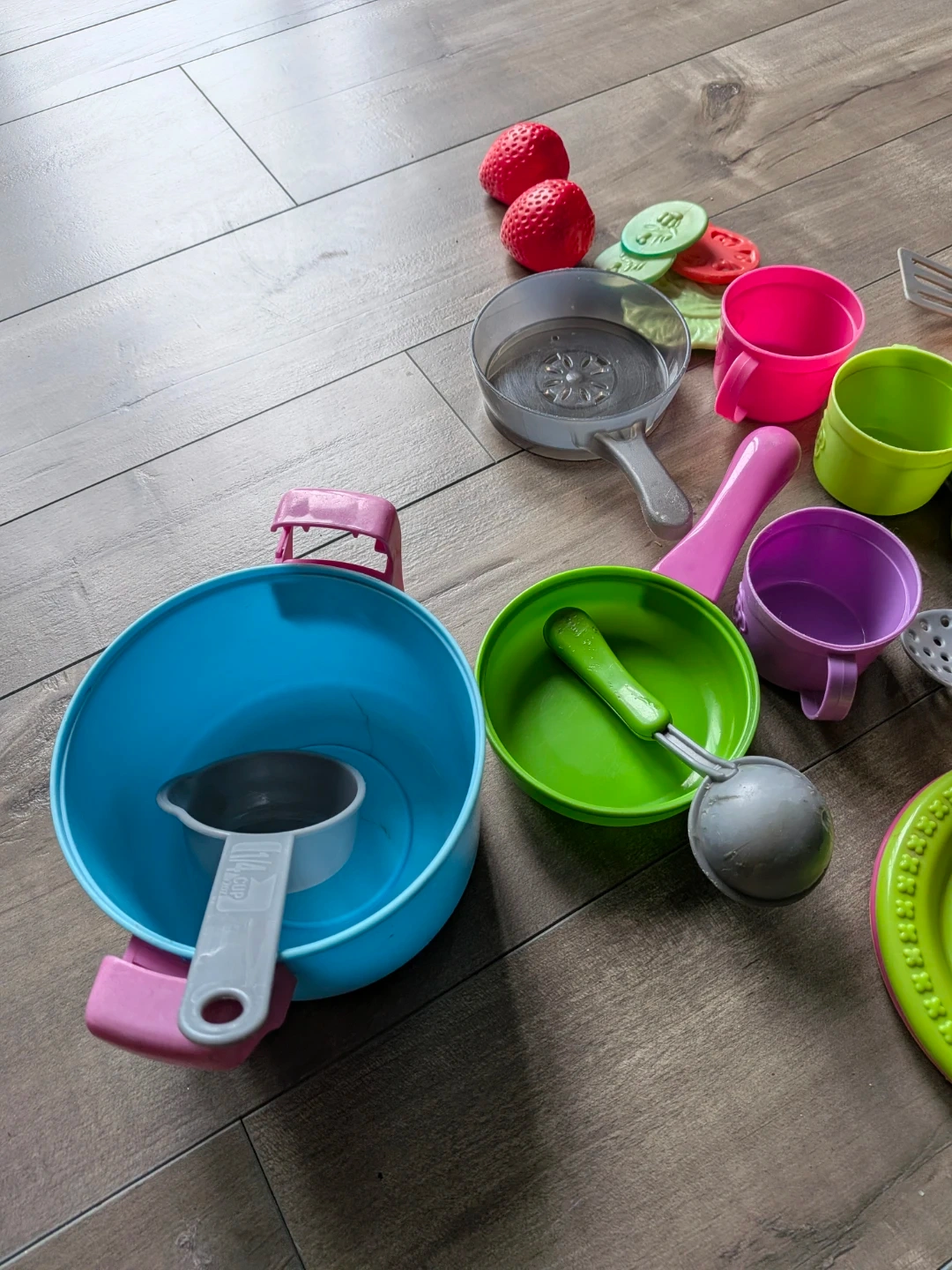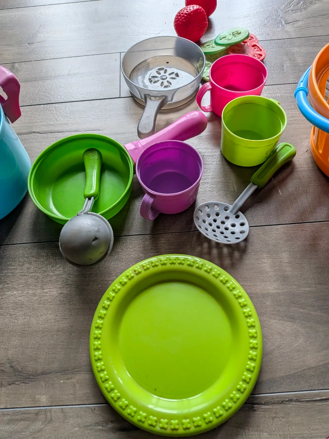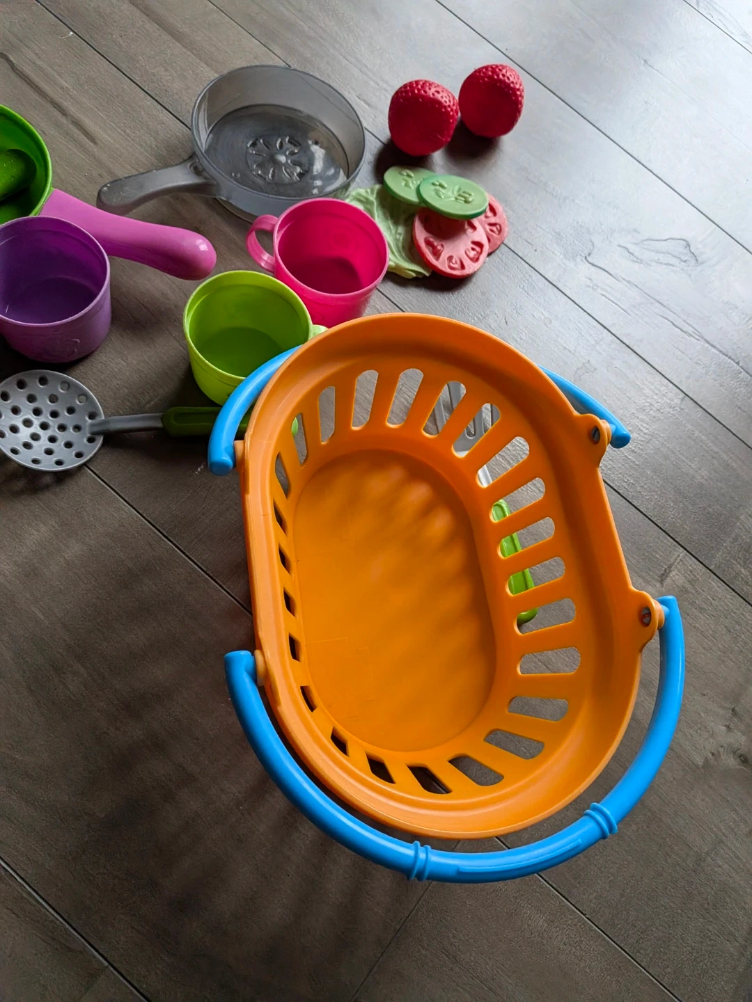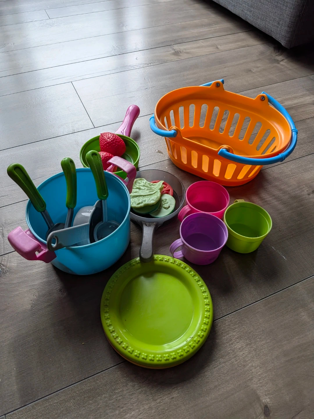 A fun set of toy kitchen items for pretend play. Includes pots, pans, cups, plates, utensils, and a shopping basket. It's made of colourful plastic and suitable for young chefs. These pieces are great for imaginative cooking adventures!