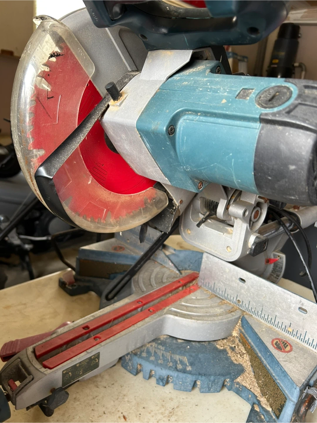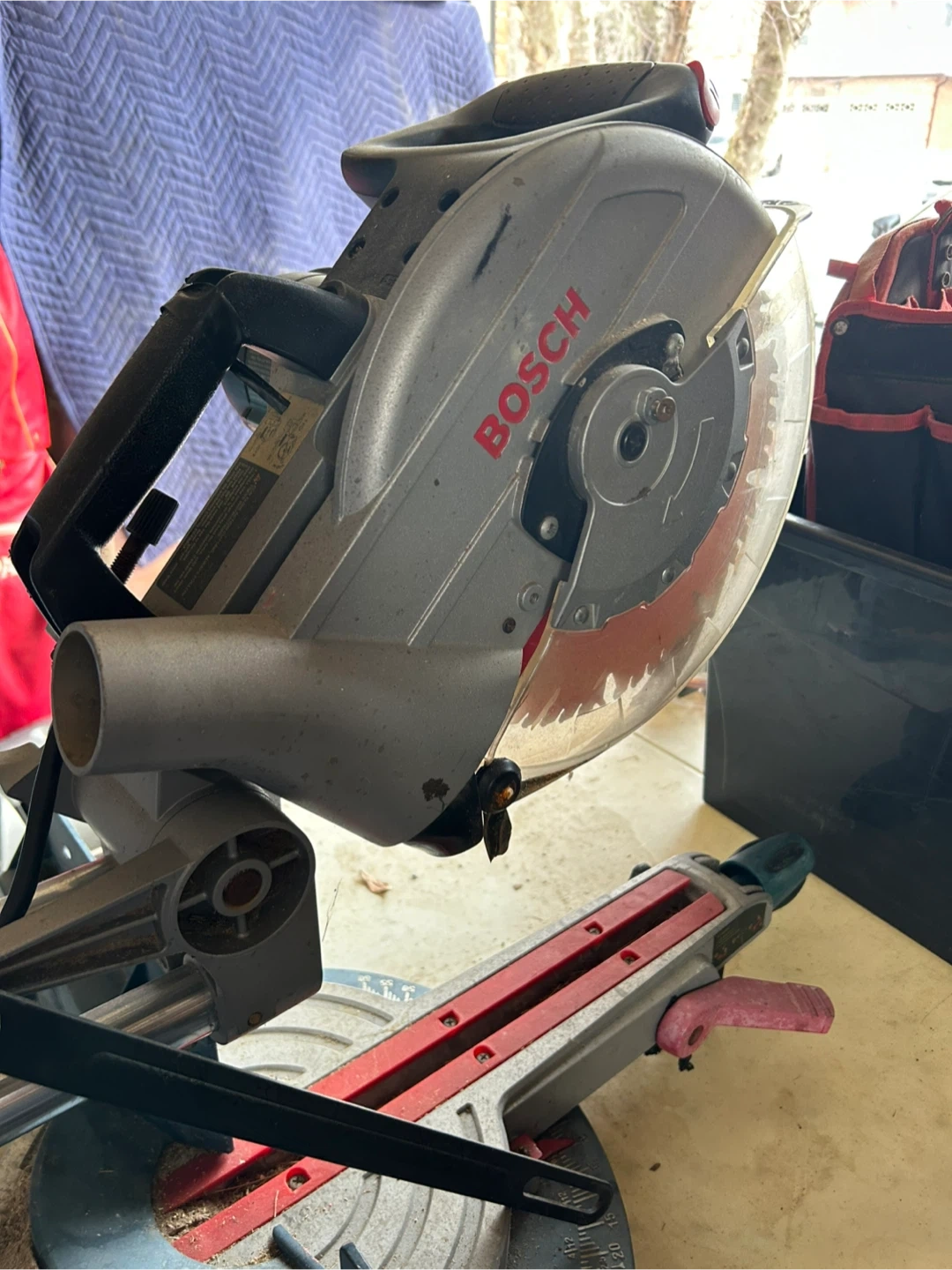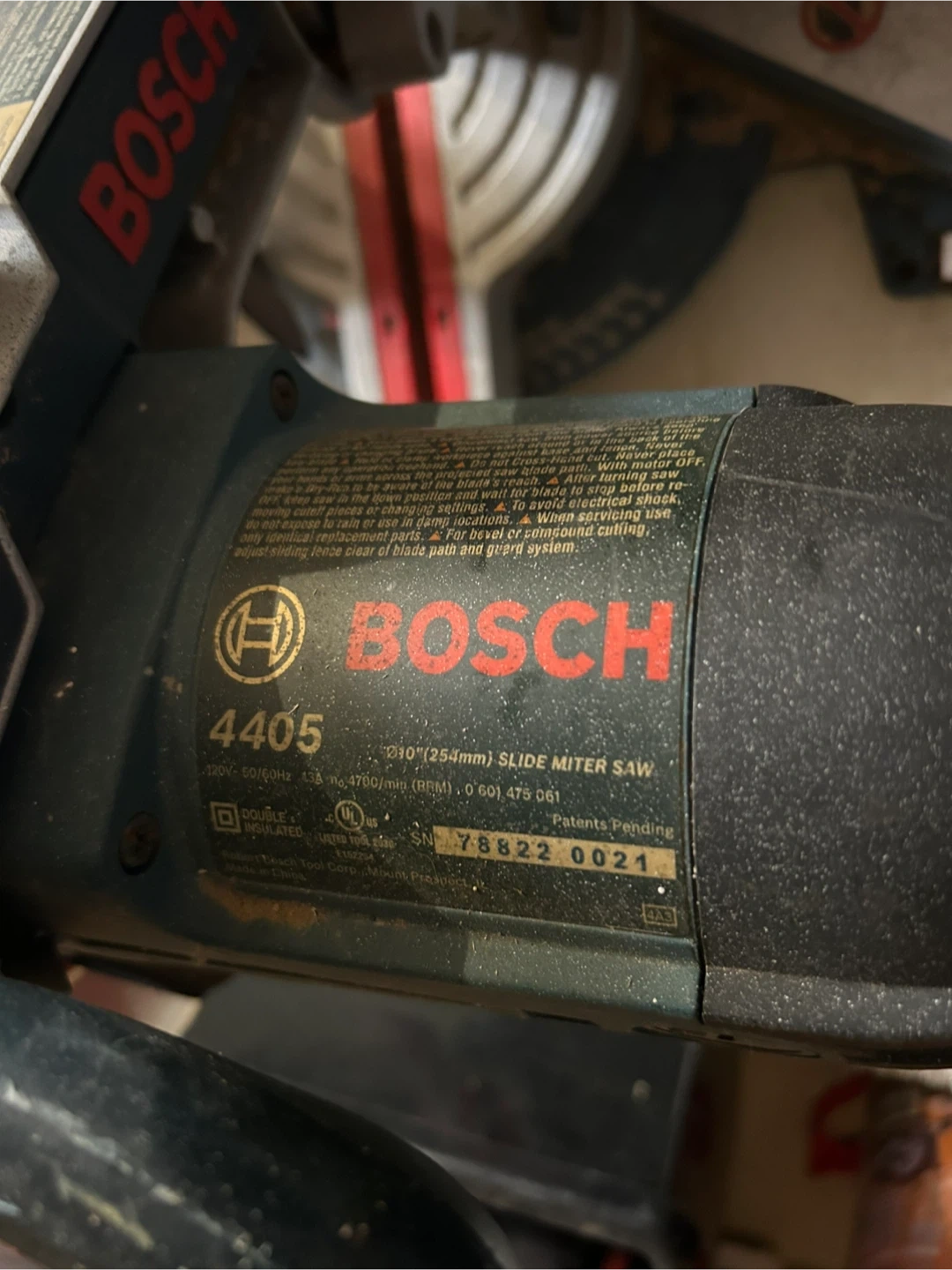 Bosch 4405 10" (254mm) slide miter saw. It's powered by a 120V, 60Hz, 15A motor with 4780 RPM. Includes an original box.