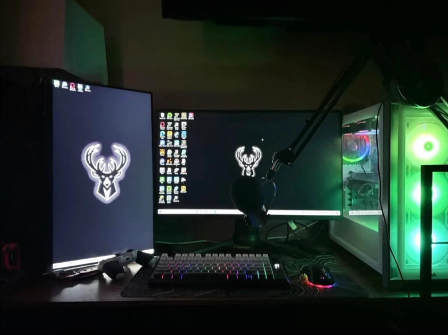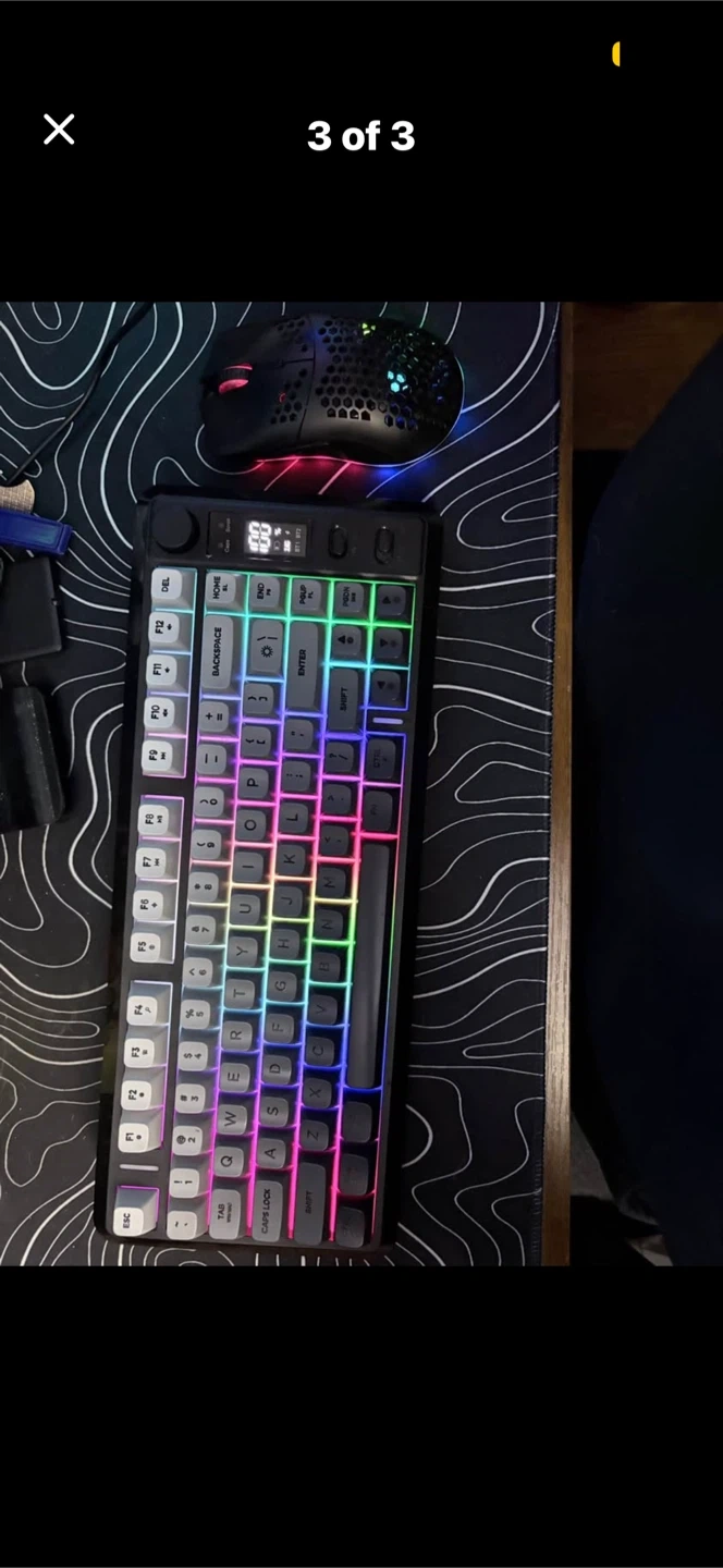 Comes with mouse and keyboard really good quality for it and the 2 monitor one of them is a 244 Hz monitor and the other one is the same and I never really use it anymore and it comes with a WebCam The headphones and microphone are not. For sale.