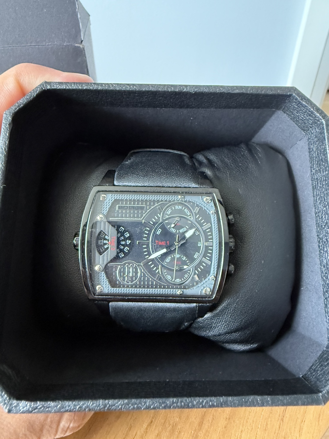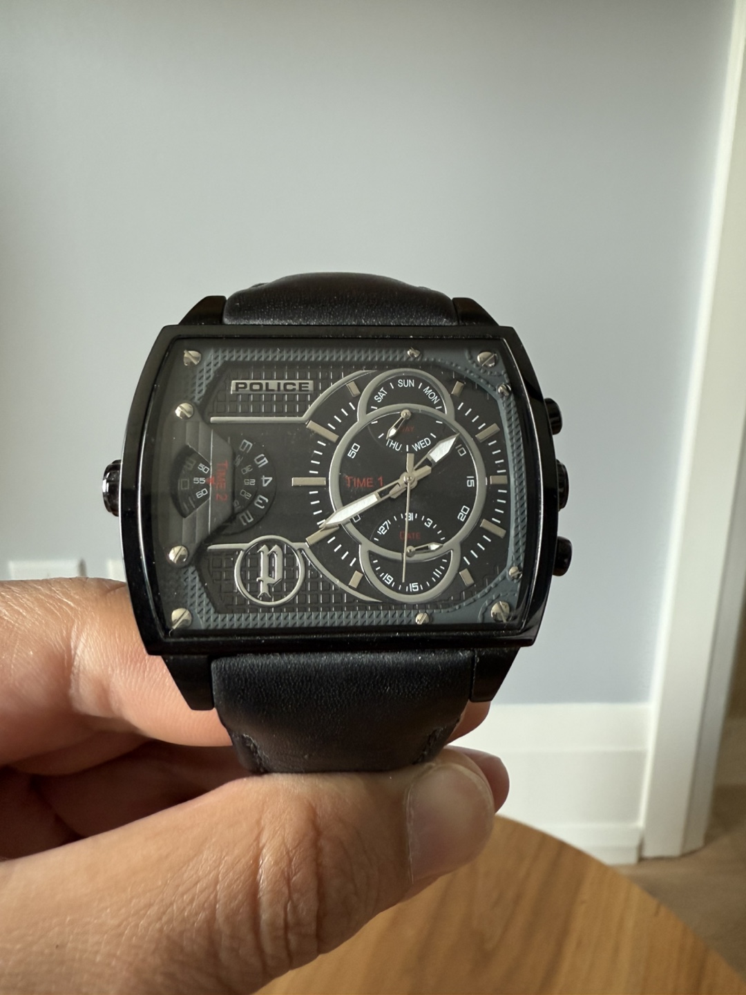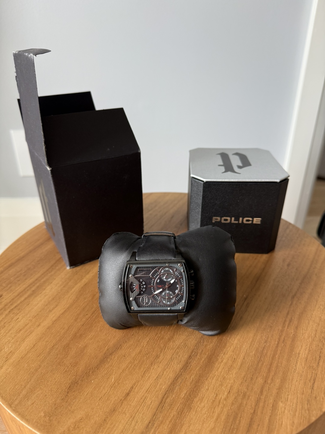 Selling a stylish Police men's watch! It has a sleek black leather strap and comes with its original box. Perfect for adding a touch of sophistication to any outfit