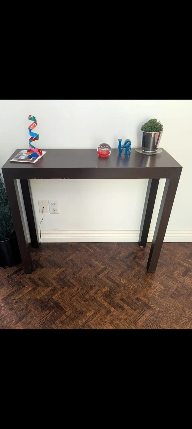 A sleek, dark brown console table. It's made of sturdy material and has a minimalist design. Its slim profile makes it great for hallways or behind sofas. It's a versatile piece for any home!