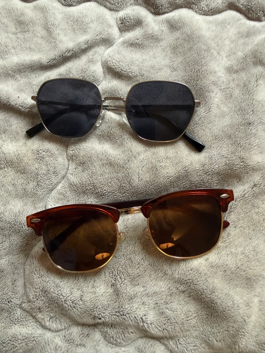 Selling two pairs of sunglasses! One pair has a silver frame and dark lenses, while the other has a brown frame with gold accents and lighter lenses. They're both in great condition and ready for a new owner