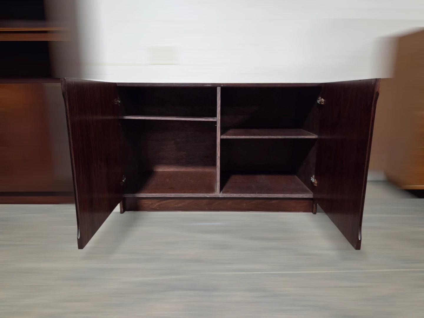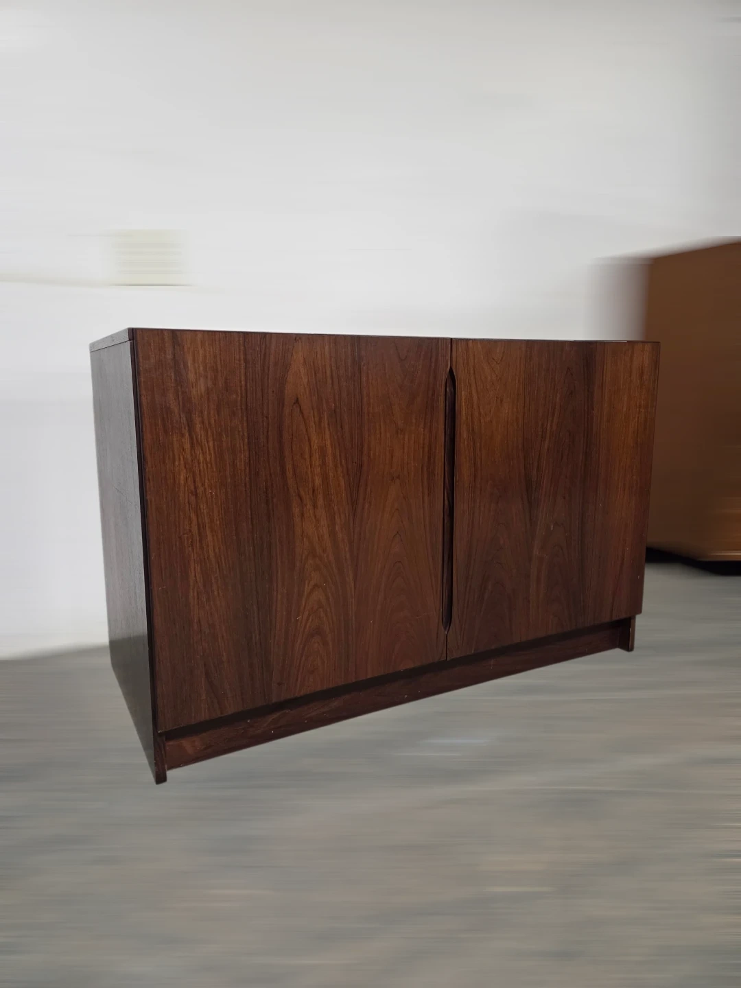 Mid century Gunni Omann Danish rosewood credenza featuring two swing open doors and two adjustable height shelves
